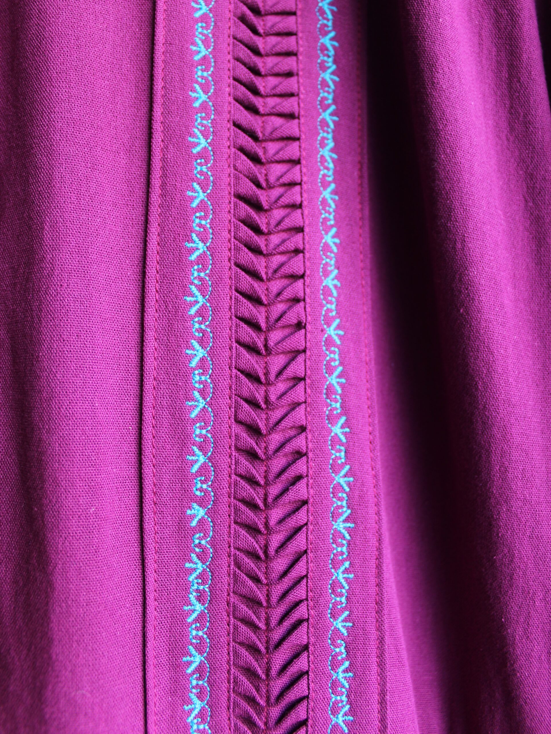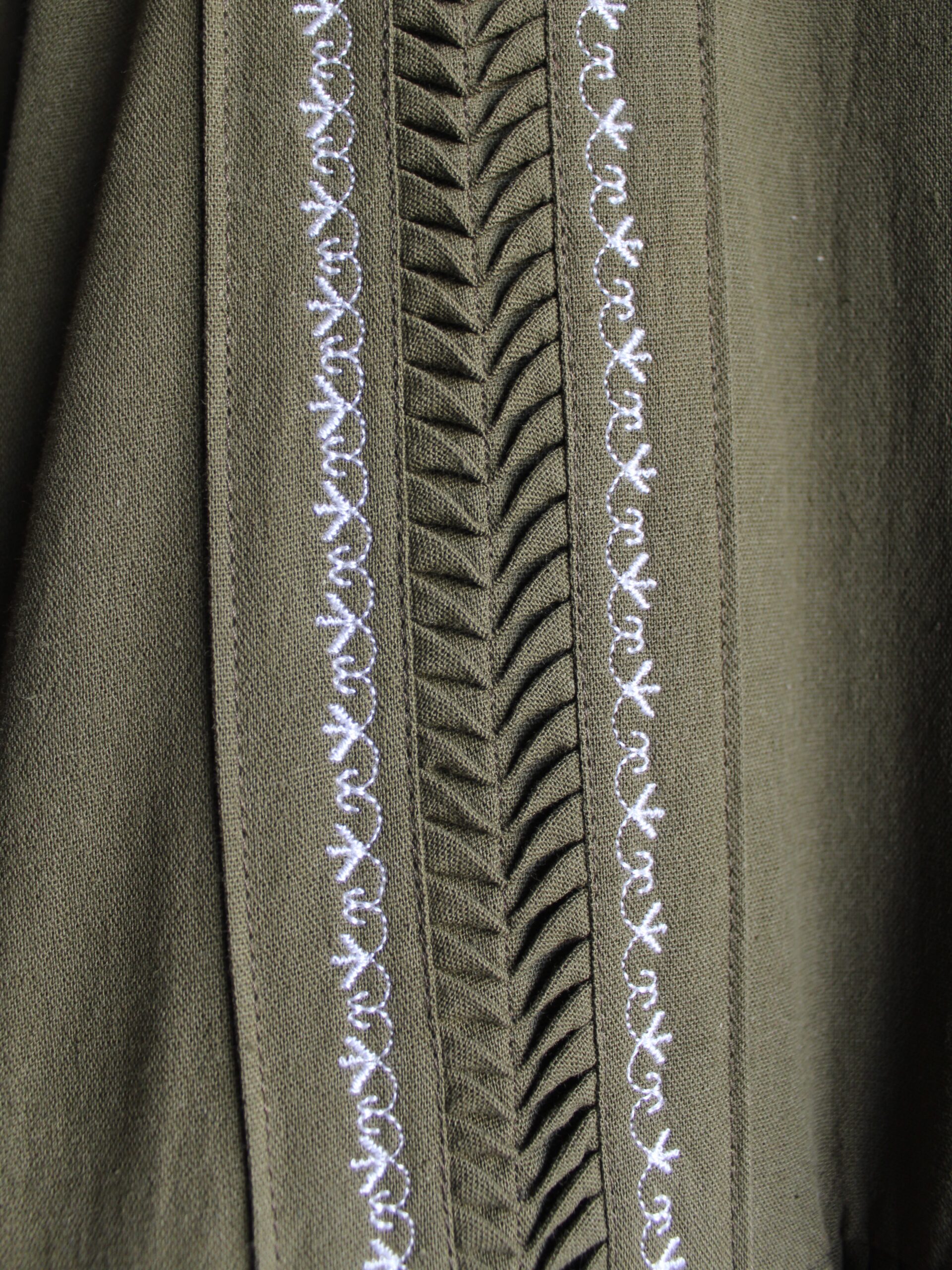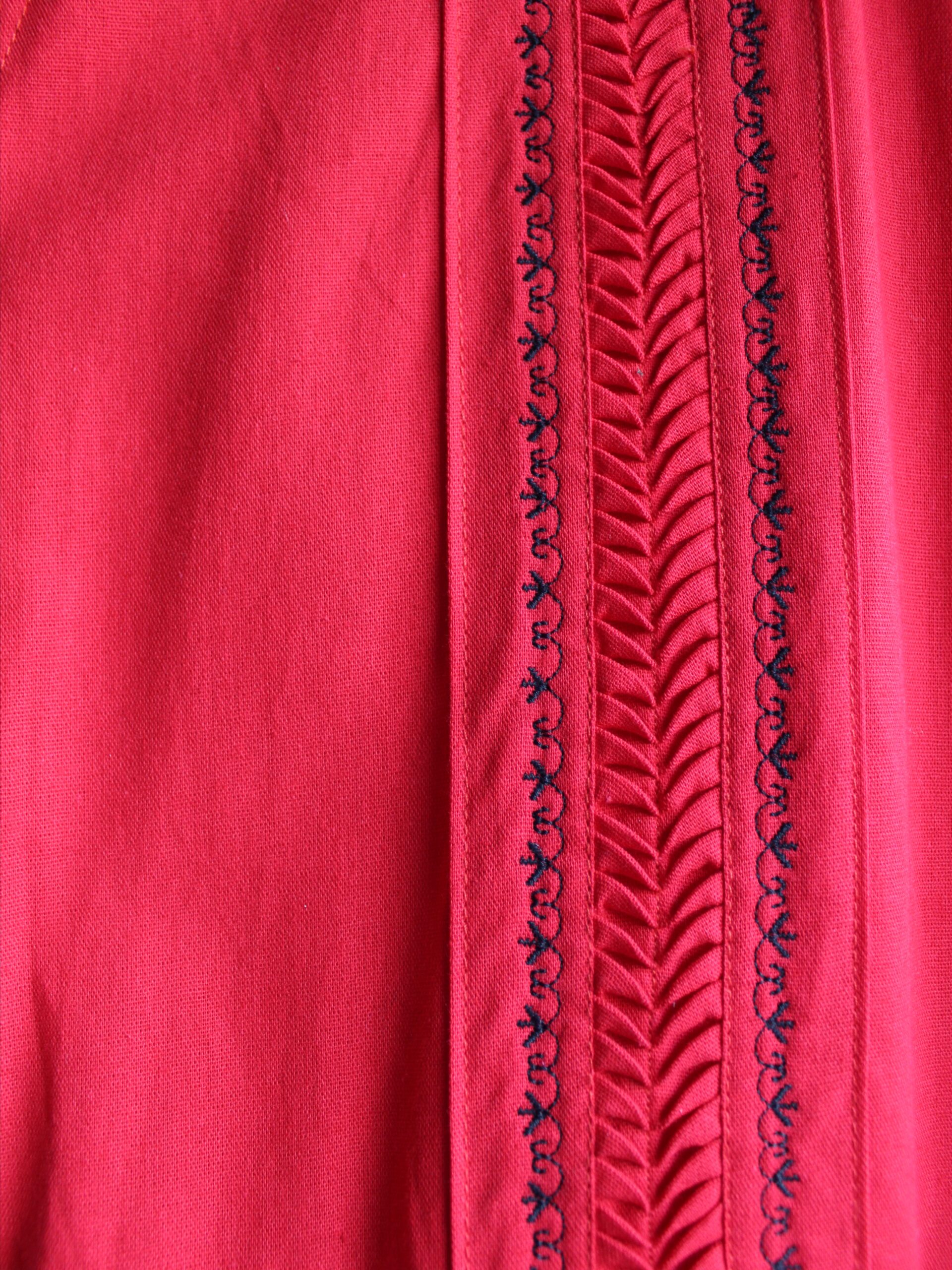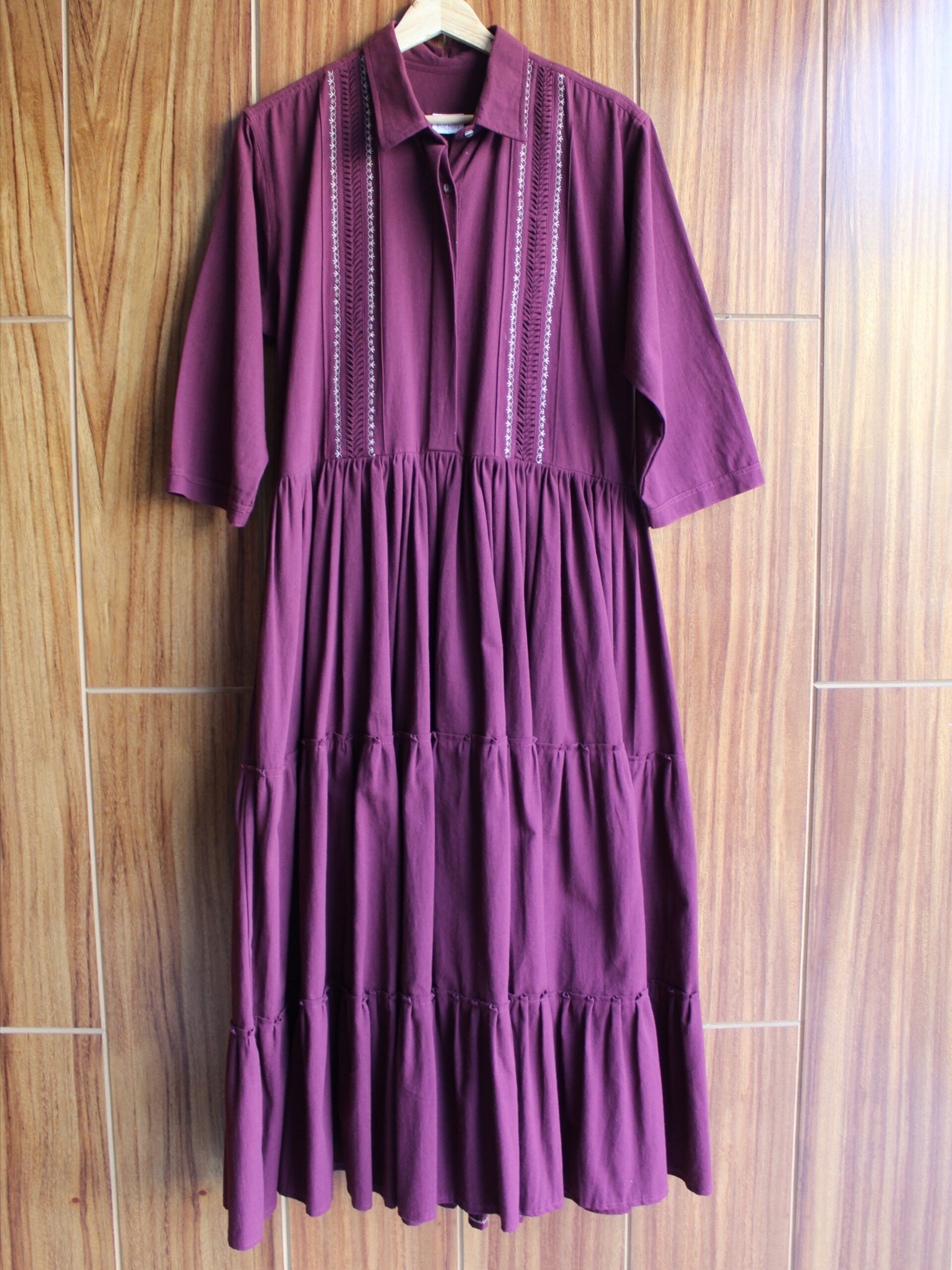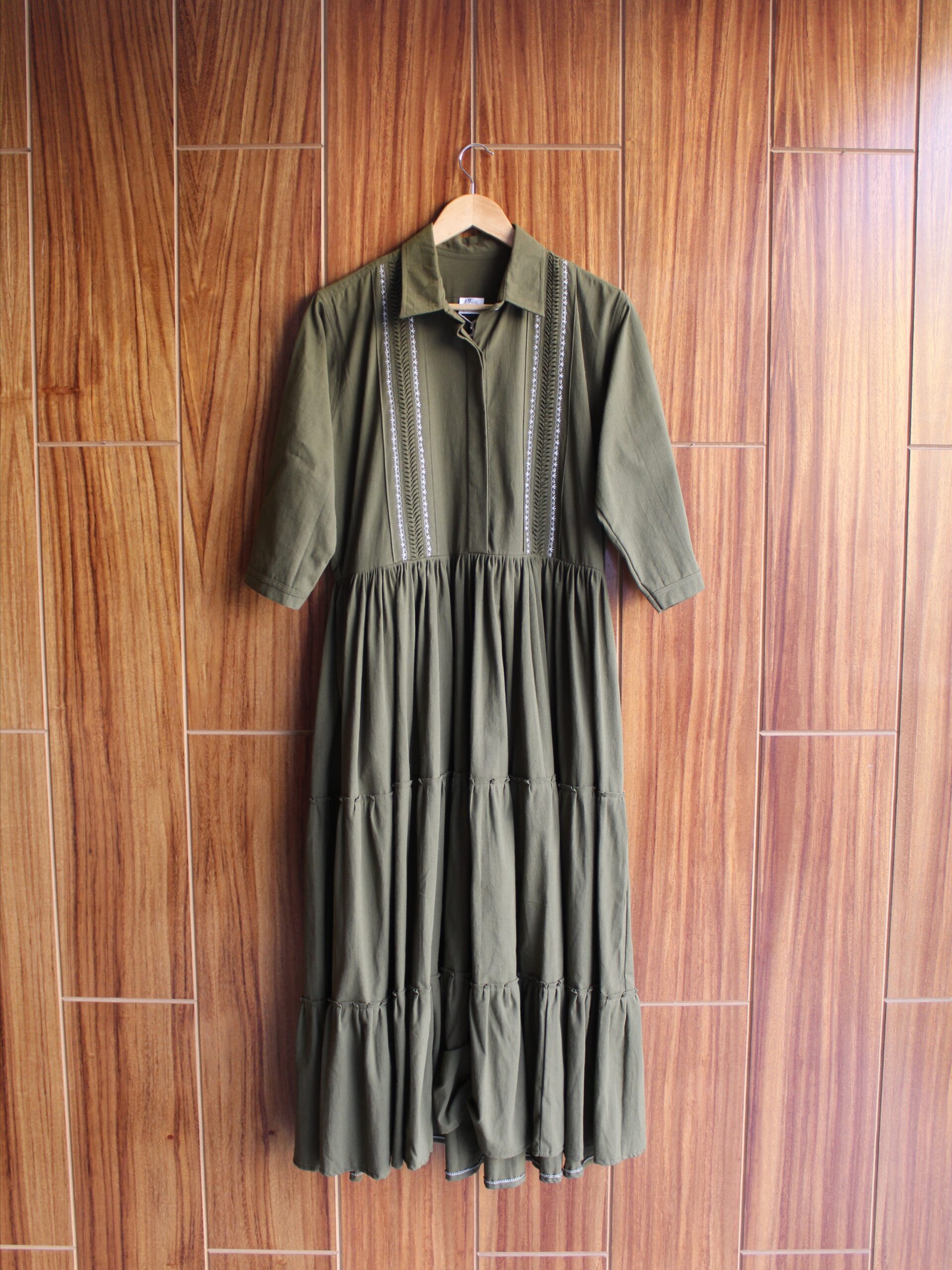 Luce este increíble vestido el cual esta compuesto por una falda amplia, unas mangas tres cuartos y cuello camisero que logran crear una pieza versátil. En la parte alta cuenta con detalles de alforzas y bordado a máquina de pedal.