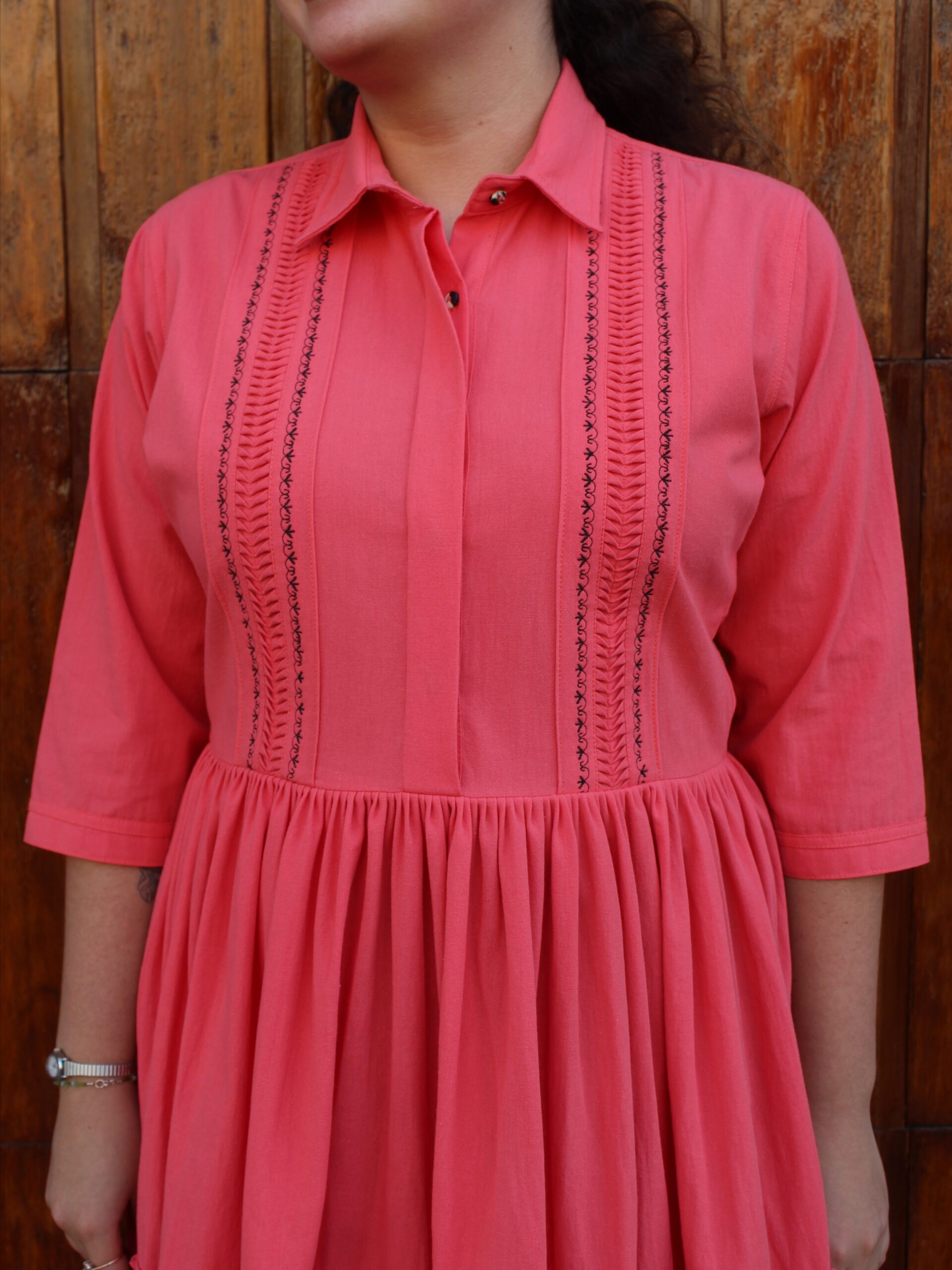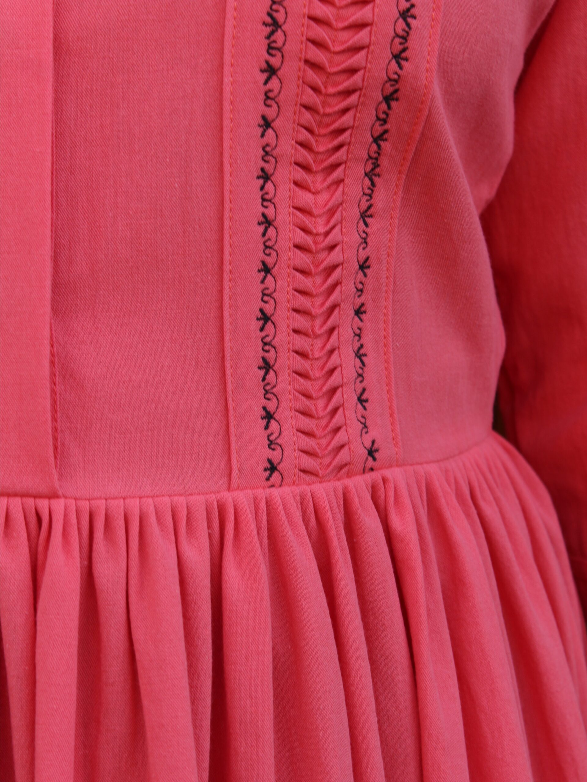 Luce este increíble vestido el cual esta compuesto por una falda amplia, unas mangas tres cuartos y cuello camisero que logran crear una pieza versátil. En la parte alta cuenta con detalles de alforzas y bordado a máquina de pedal.