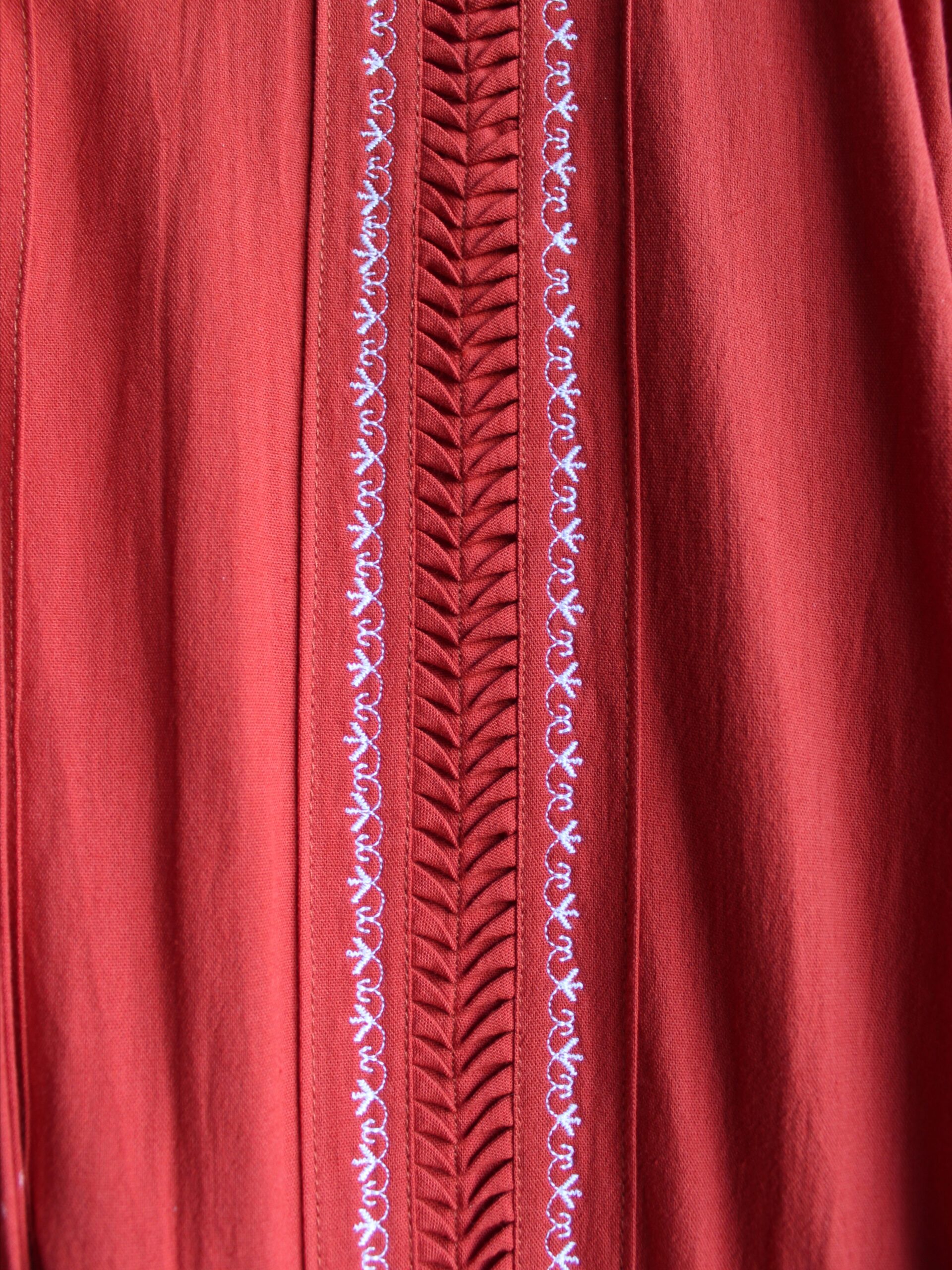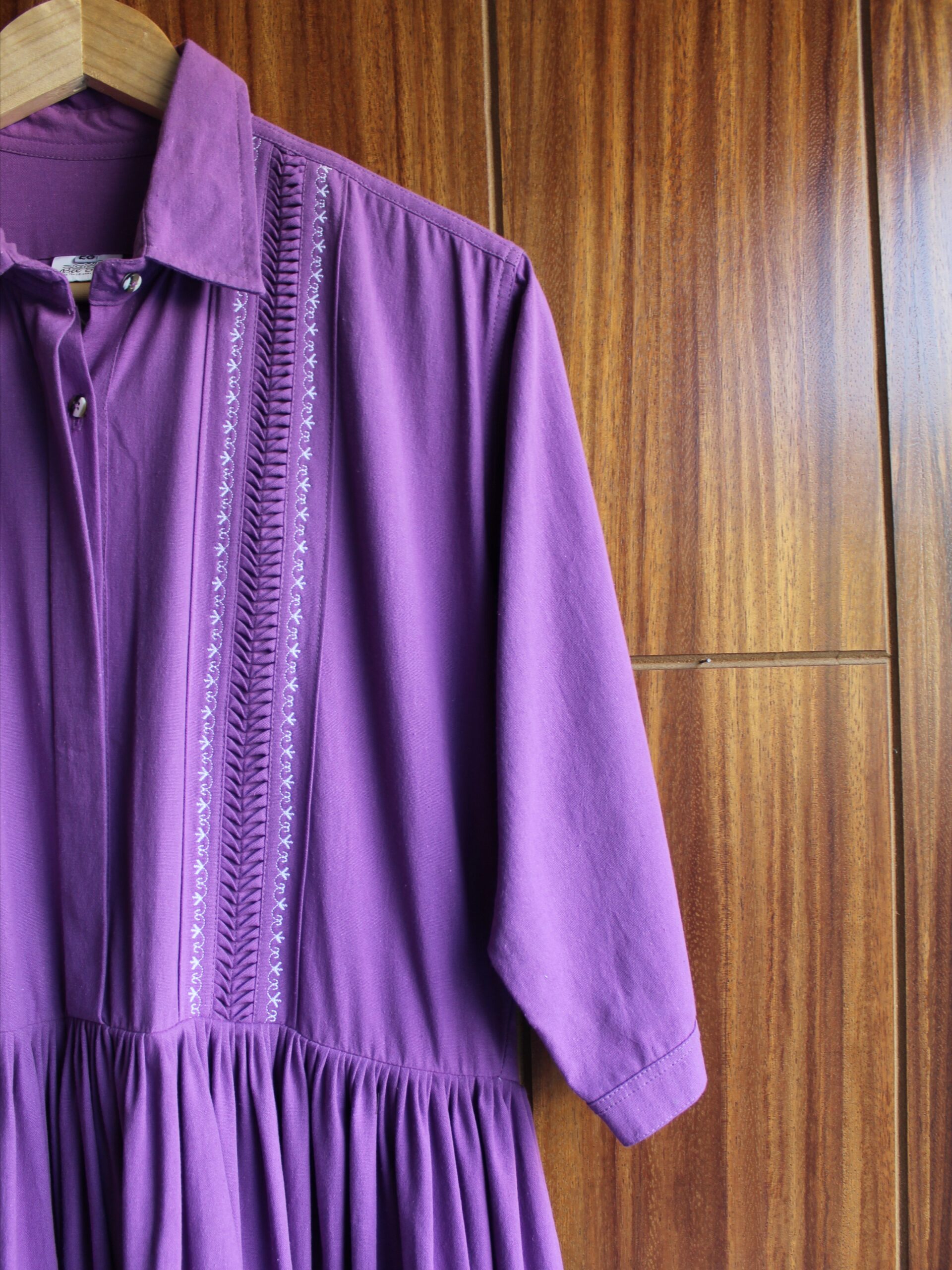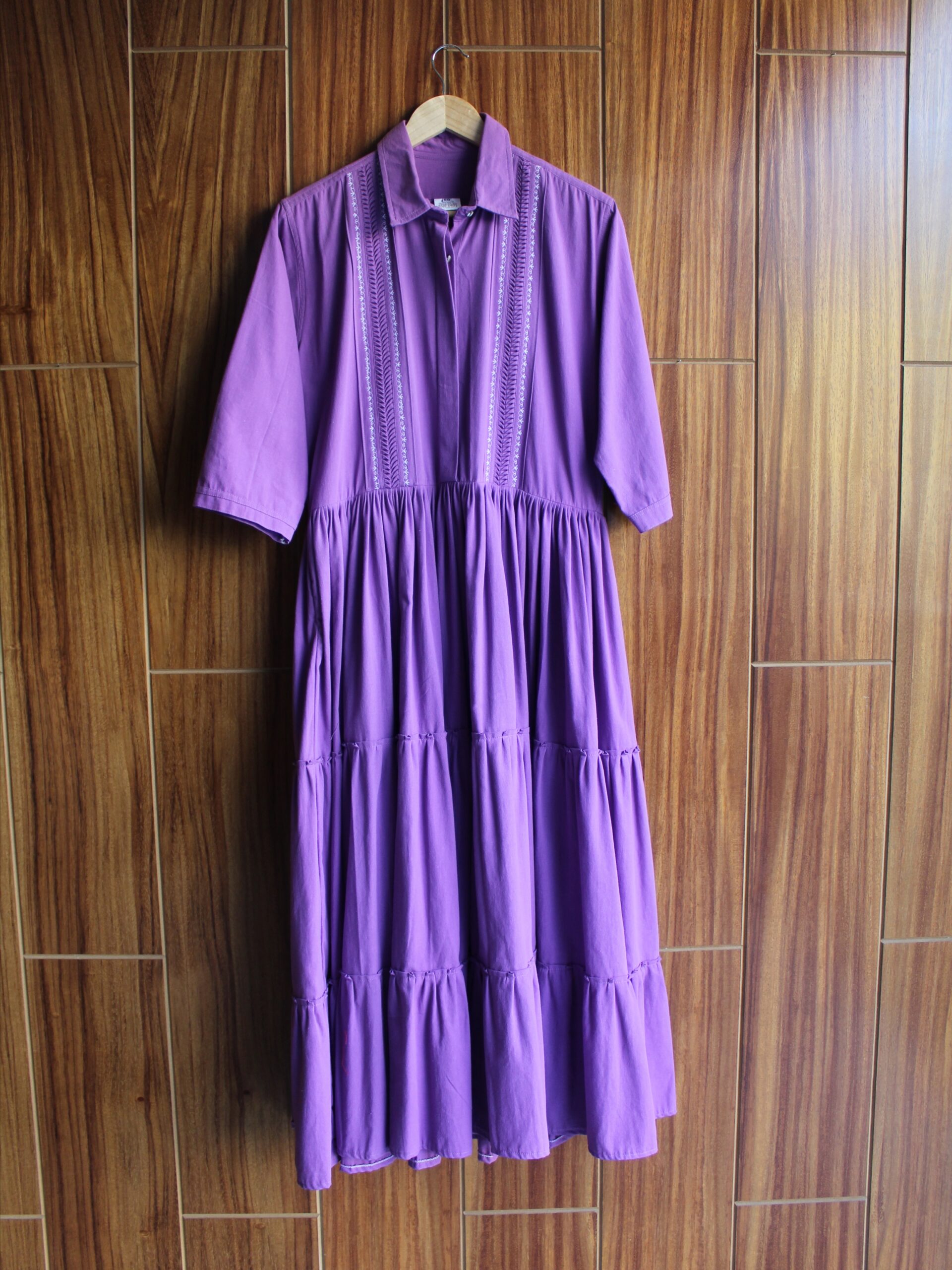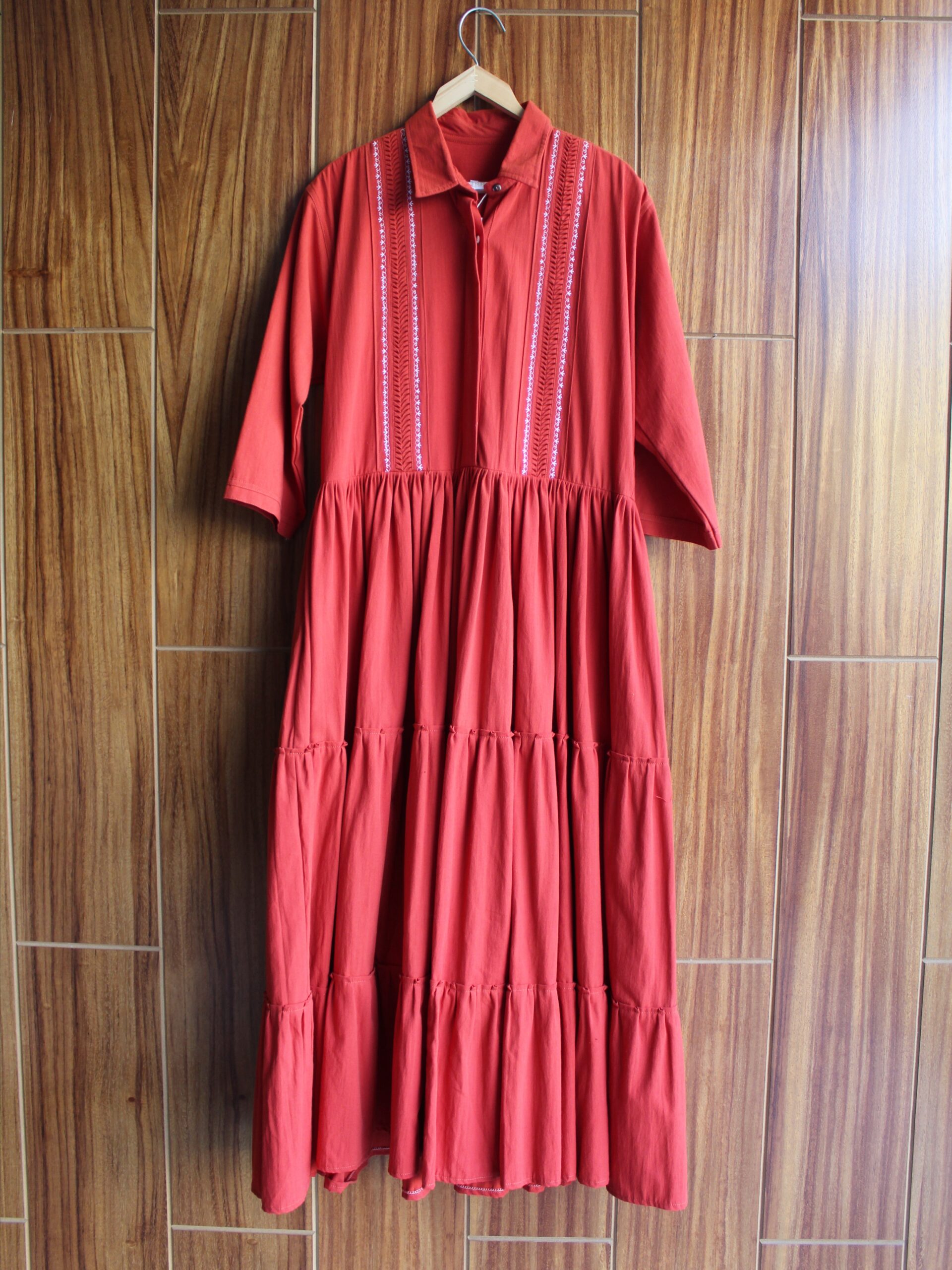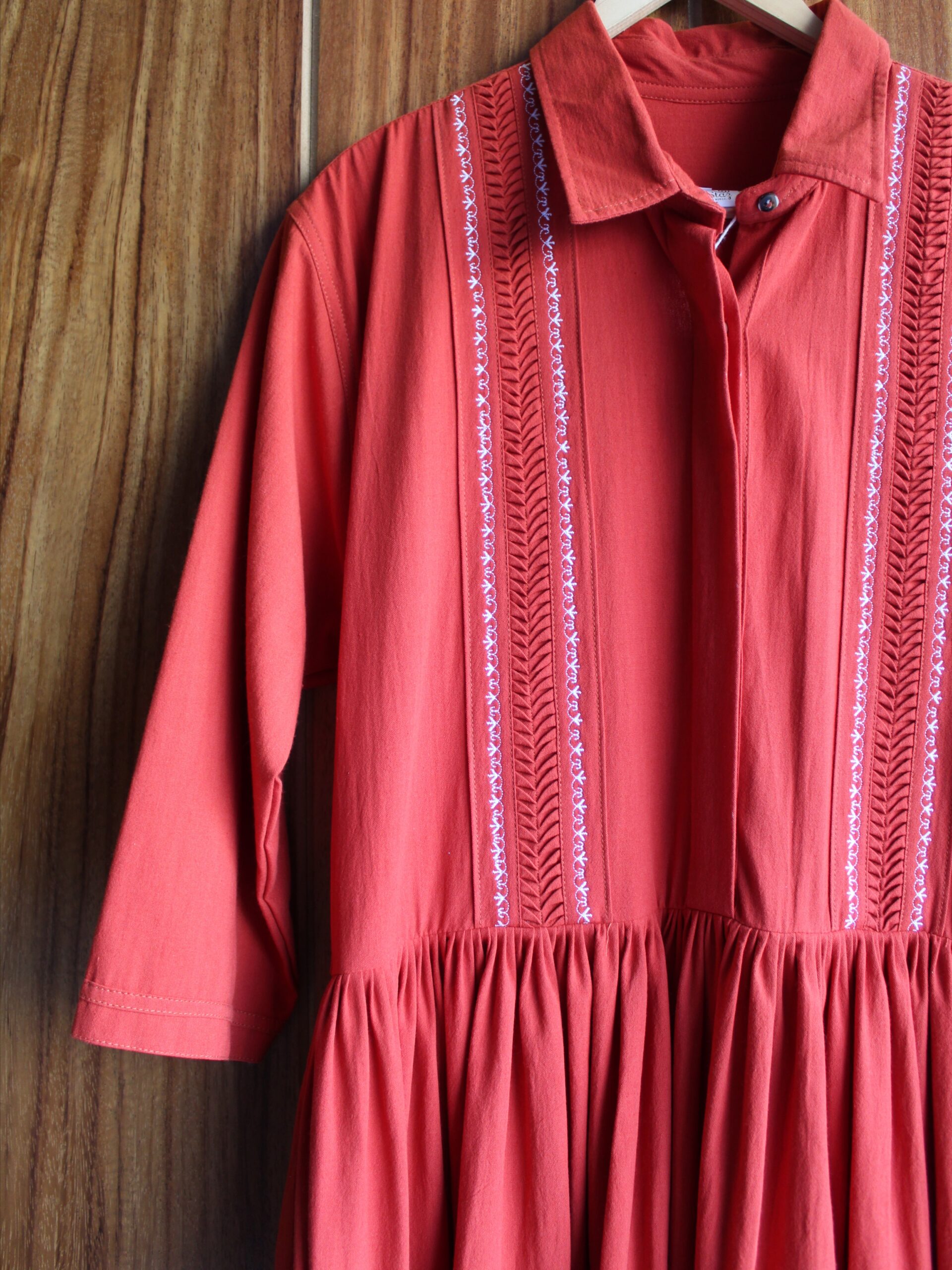 Luce este increíble vestido el cual esta compuesto por una falda amplia, unas mangas tres cuartos y cuello camisero que logran crear una pieza versátil. En la parte alta cuenta con detalles de alforzas y bordado a máquina de pedal.