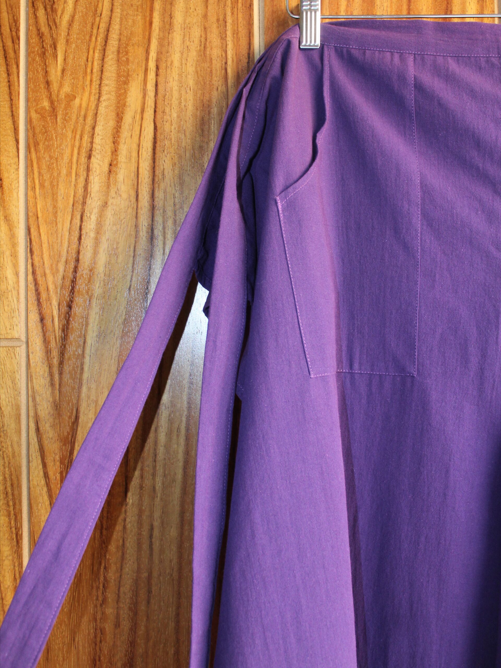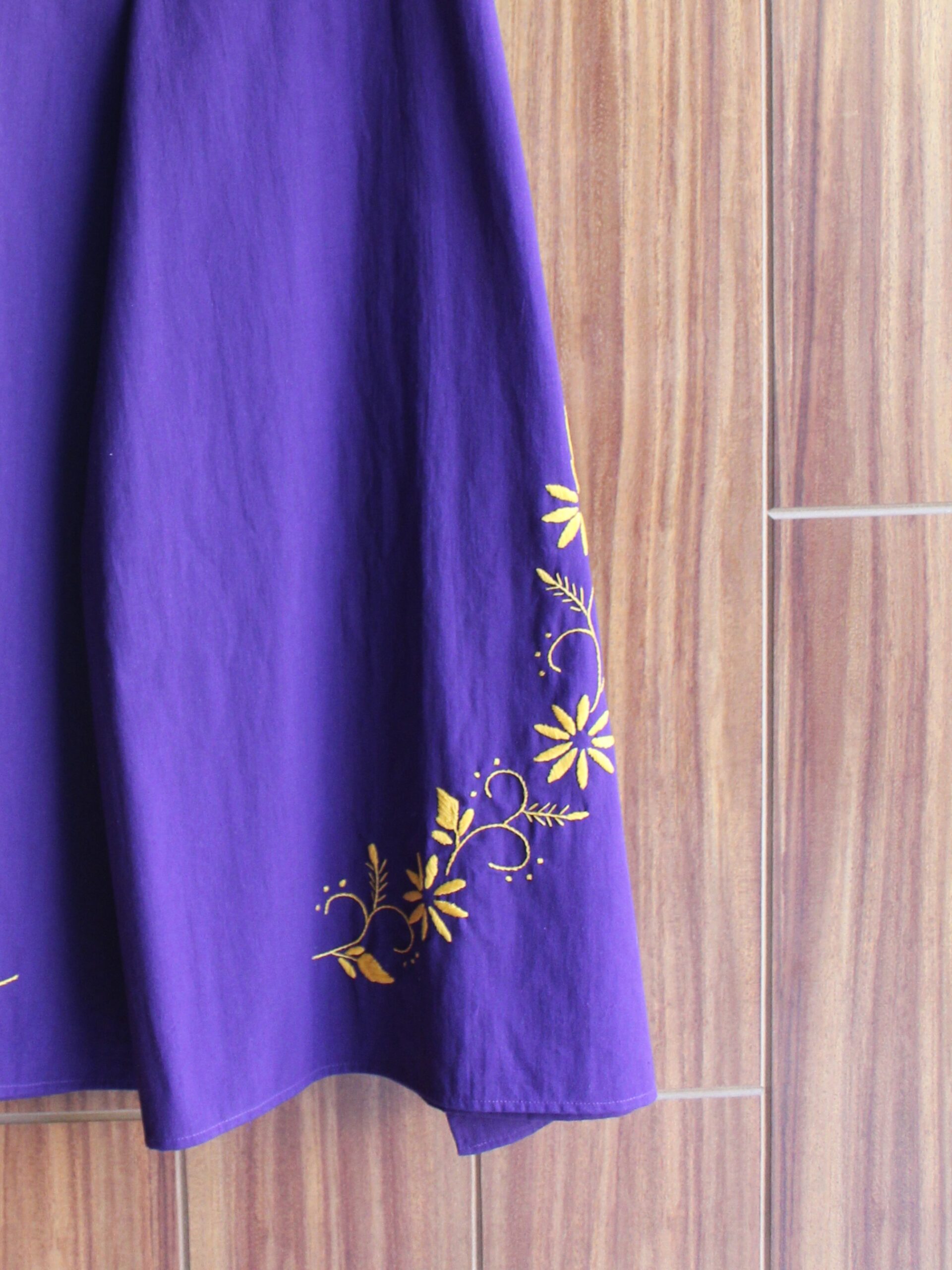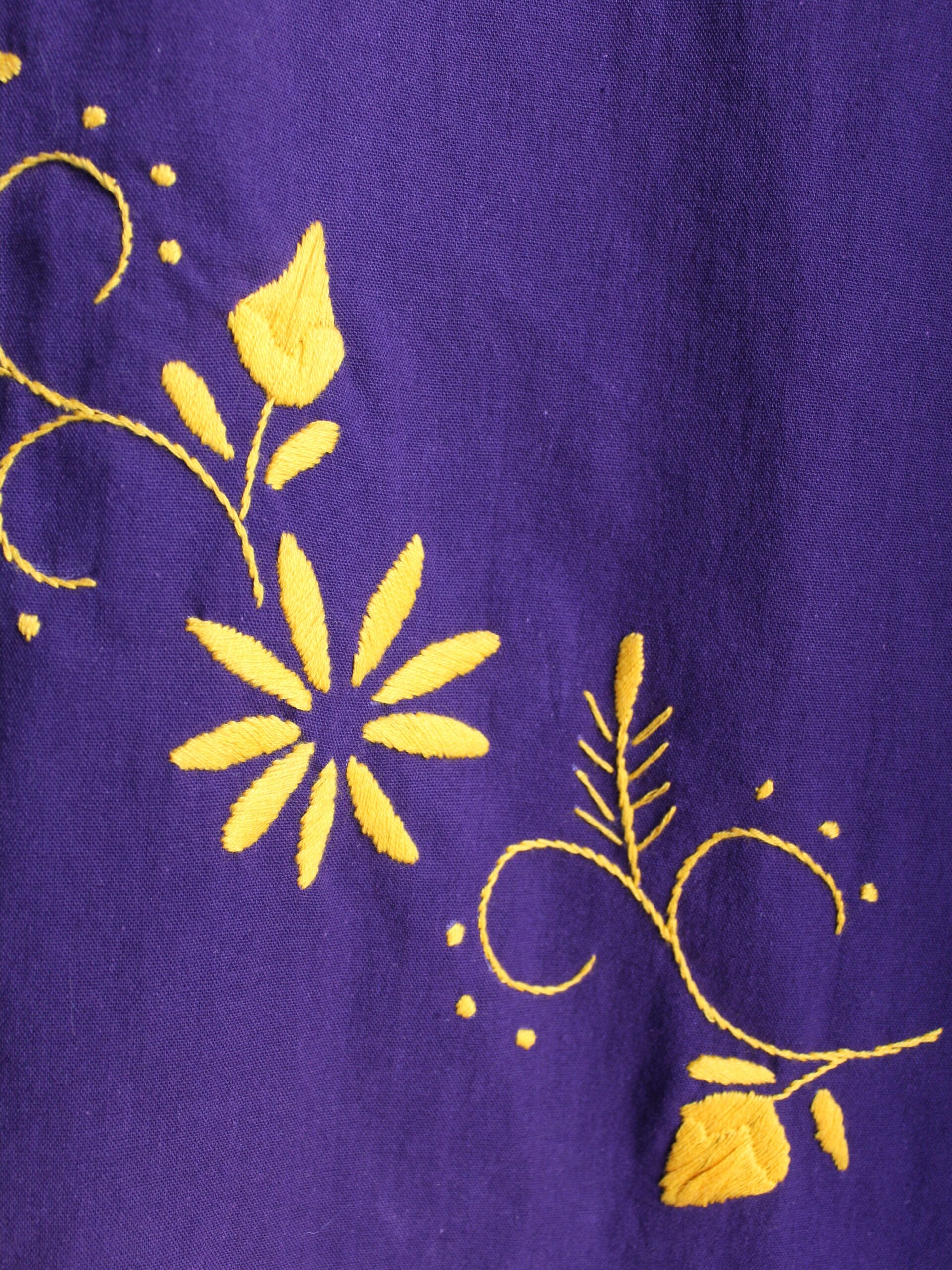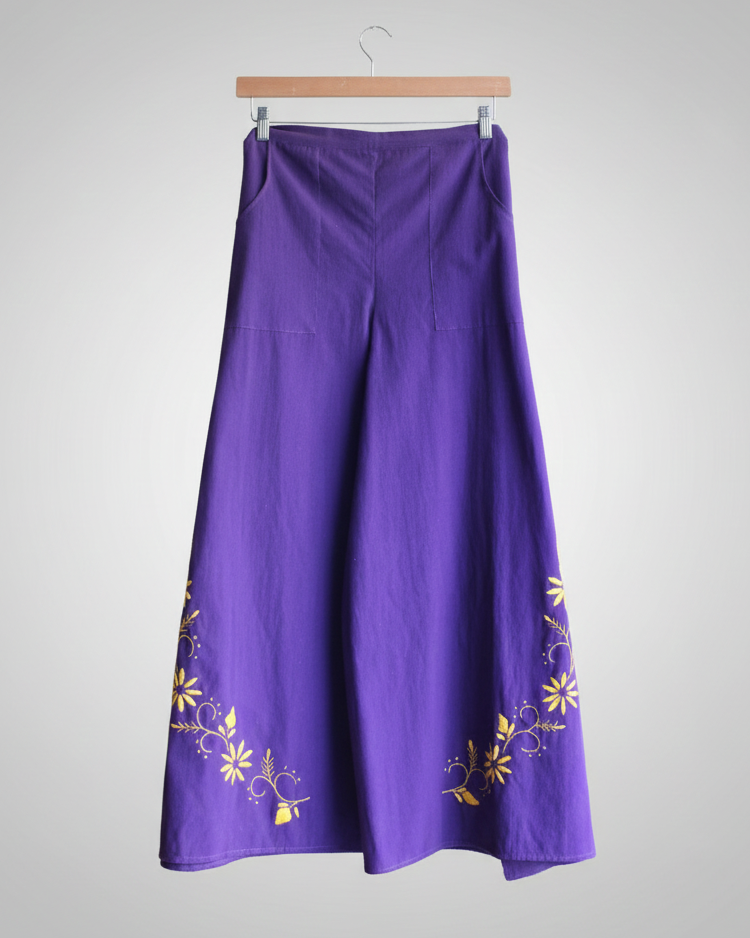 Confeccionado en tela de manta color morada con diseño de pierna ancha y el toque mágico lo da el delicado bordado floral hecho a mano.