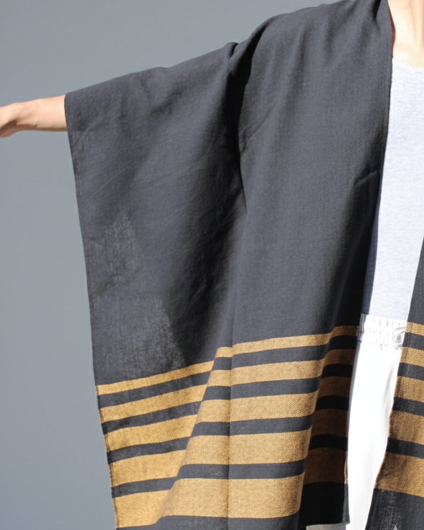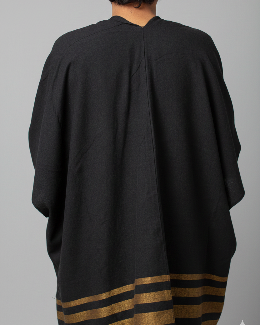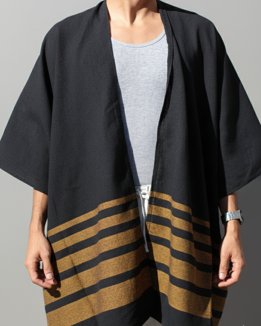 El diseño en negro absoluto con líneas doradas precisas le da un aire dramático y chic, perfecto para las noches frescas o como la pieza central de tu look. Un abrazo cálido con un toque de glamour artesanal.