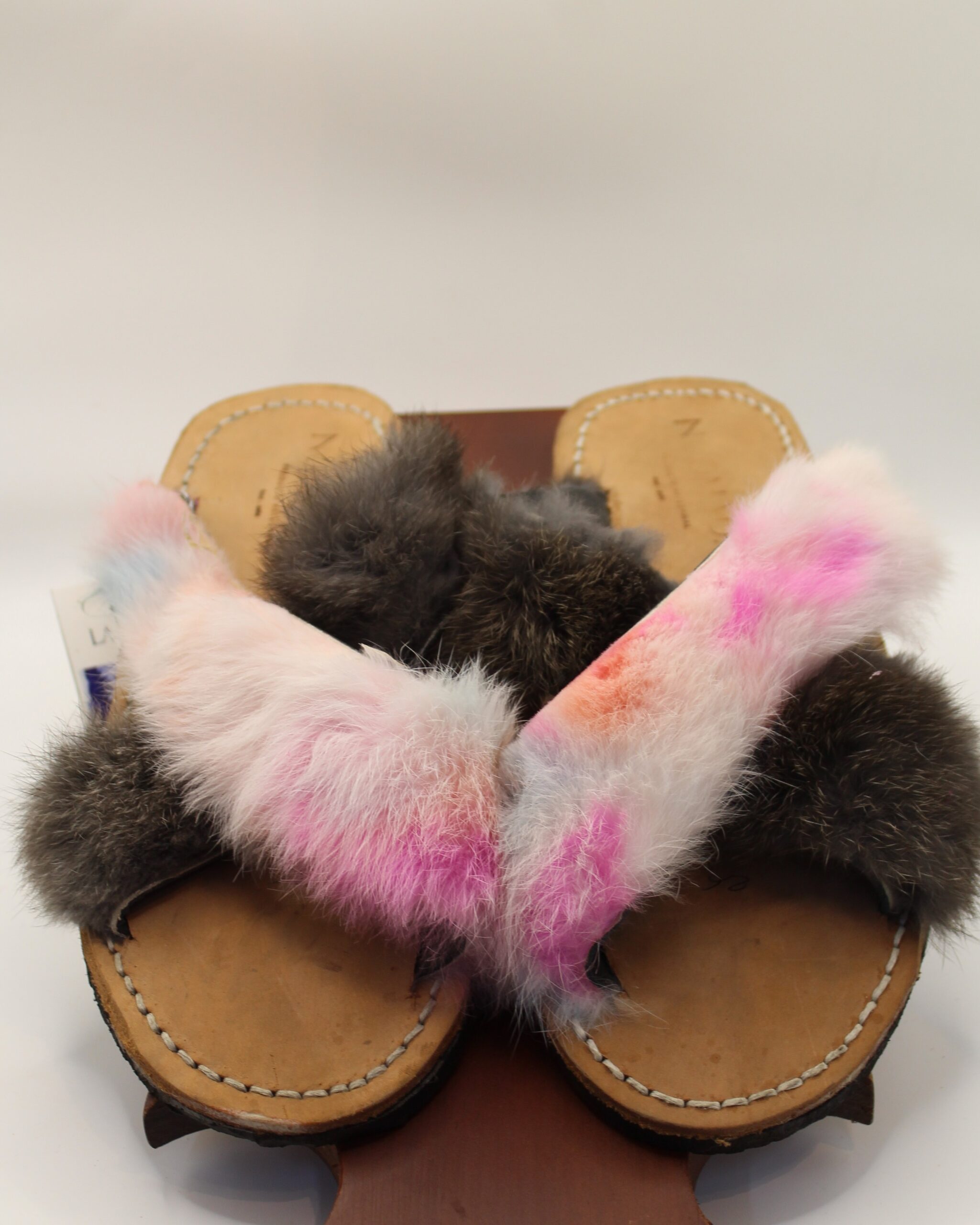 Sandalias artesanales elaboradas en piel de conejo, suaves y cómodas, disponibles en una variedad de colores.