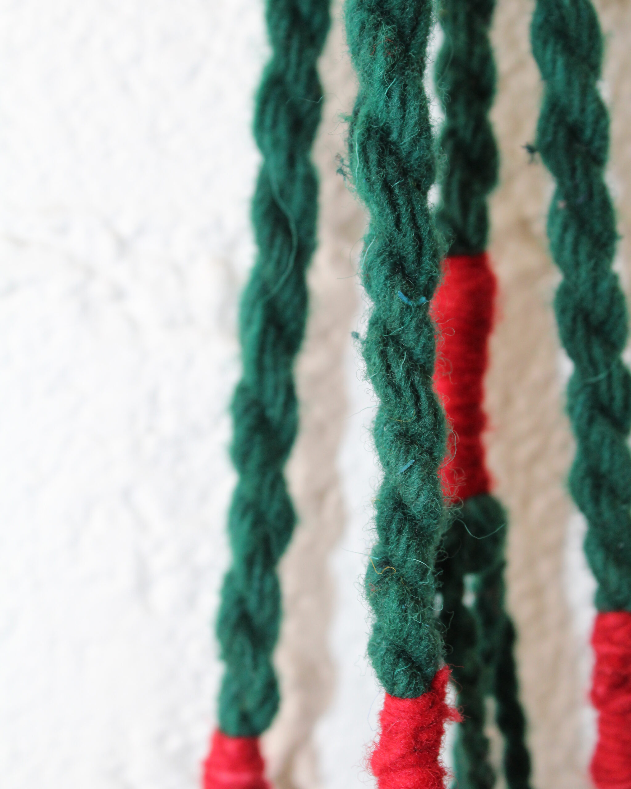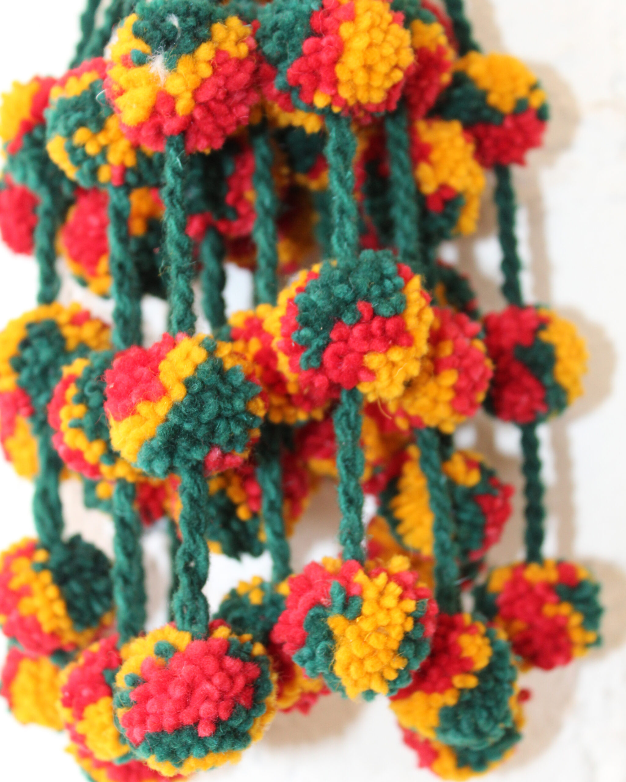 Par de tlacoyales hechos de lana, en forma de pompones, color verde, anaranjado y rojo con lazo color verde ideal para trenzar tu cabello.