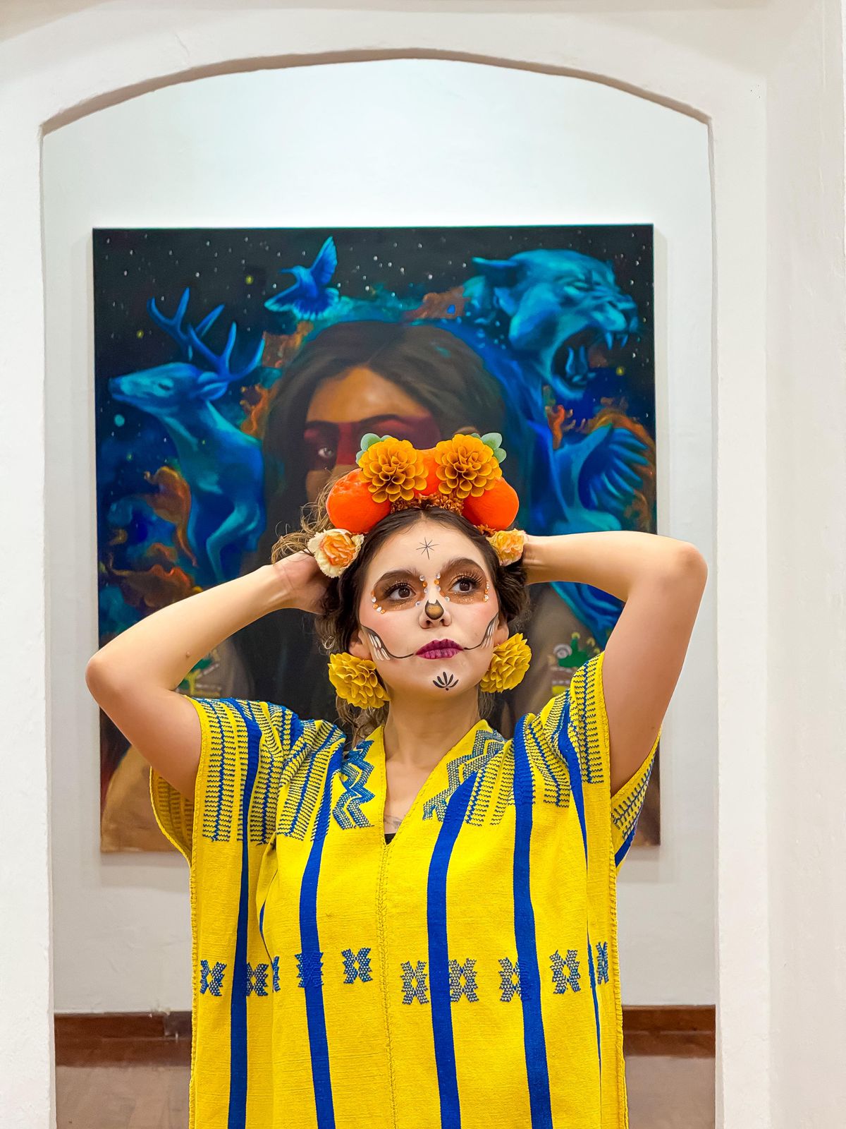 Luce espectacular con este bonito tocado con flores de cempasúchil hechas a manos con tela almidonada teñida con tintes naturales, las acompañan también flores y mandarinas artificiales.