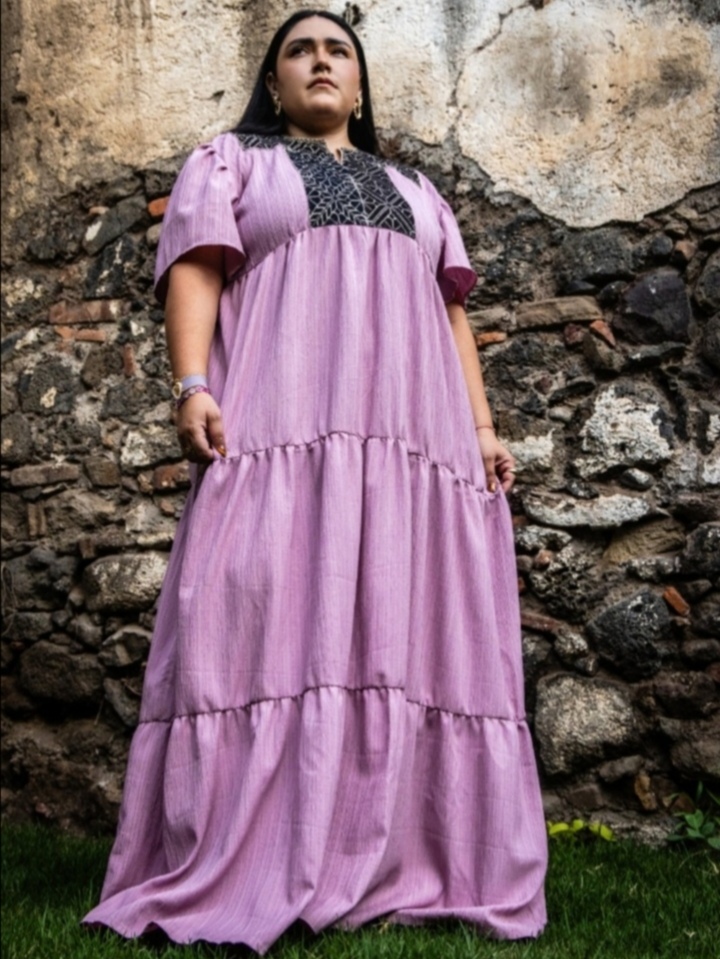 Hay prendas que cuentan una historia, y este vestido es una de ellas, elaborado en un tono lila, esta pieza destaca por su impresionante pechera bordada en contraste oscuro, que añade un aire de sofisticación y carácter. Con mangas y una falda de tres niveles que aporta un movimiento espectacular, es el vestido diseñado para quienes buscan brillar con autenticidad.