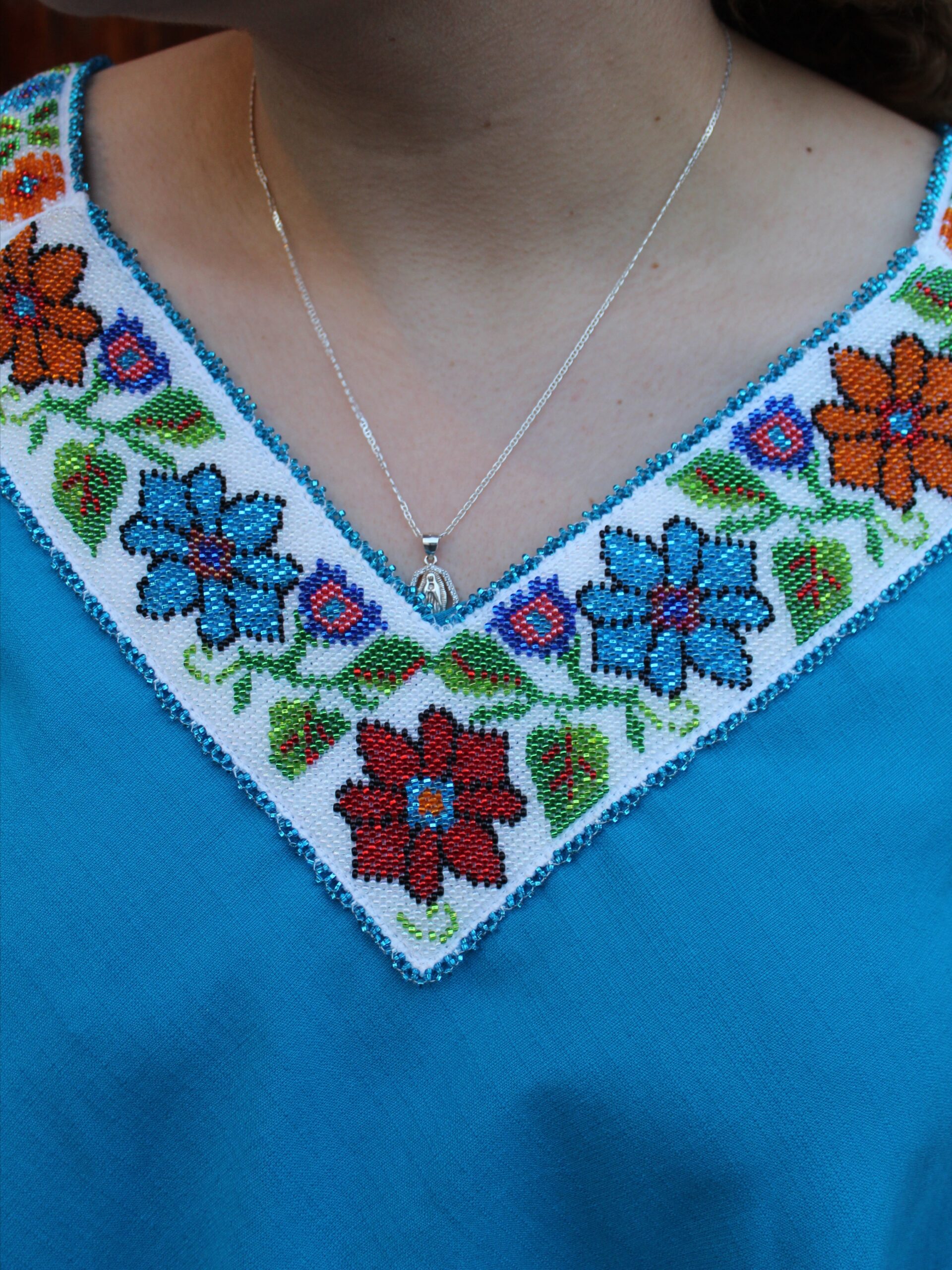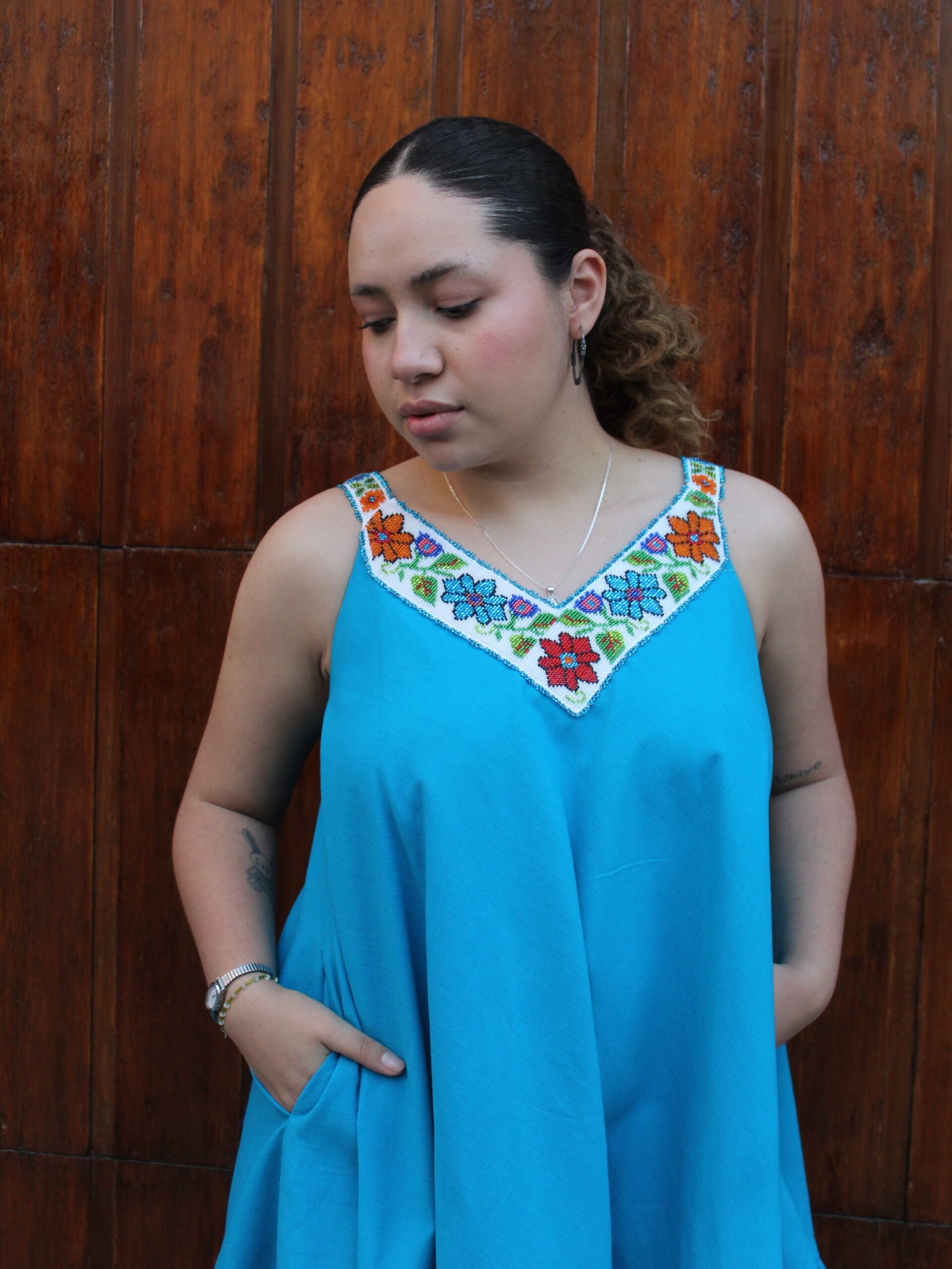 Viste fresca y segura con este bello vestido hecho de lino algodón con un espectacular escote en V que tiene un diseño único elaborado bordado de chaquira hecho a mano los cuales crean un patrón de flores. Además cuenta con bolsas que hará más practico su uso.