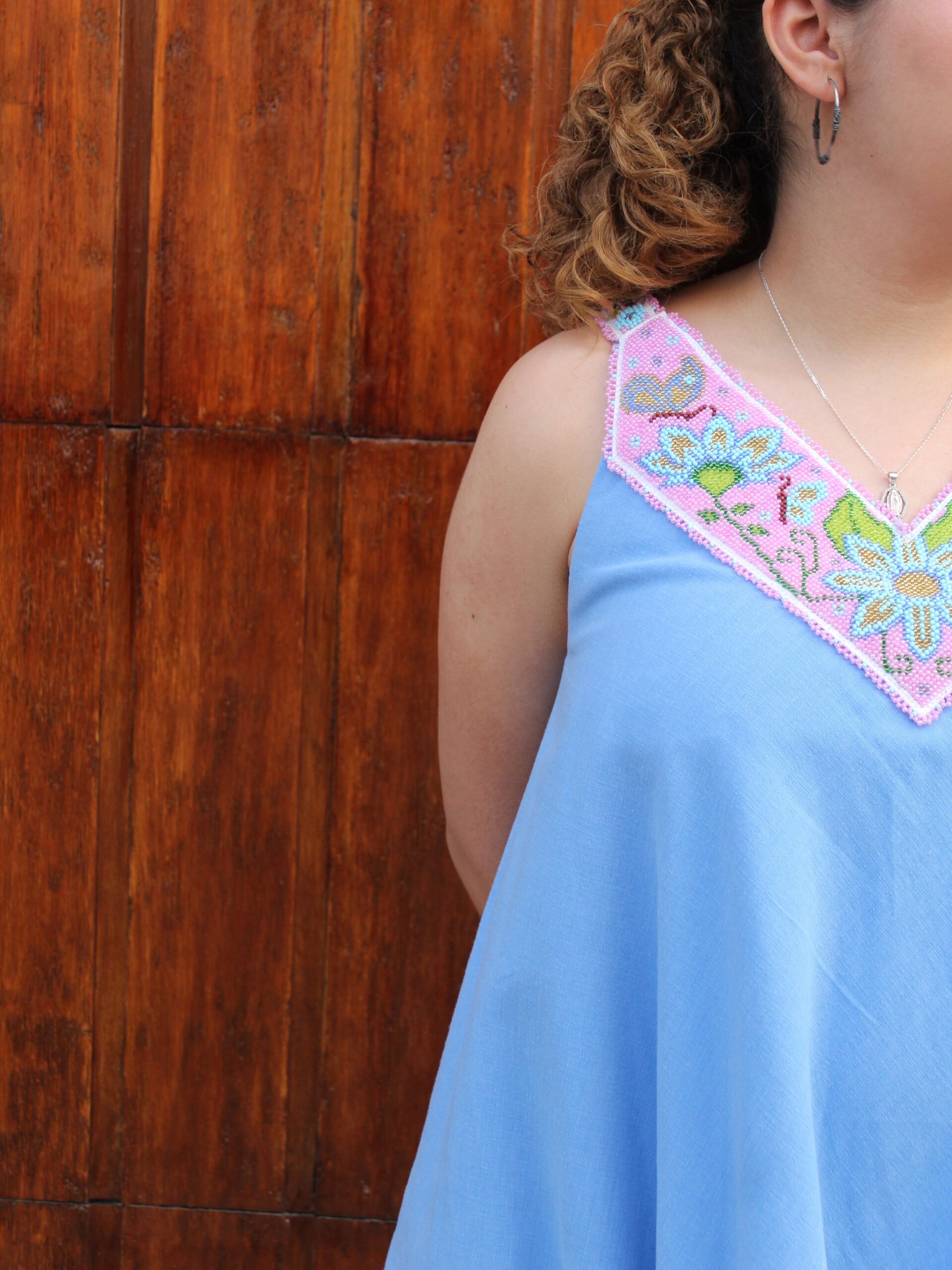 Atrévete a lucir deslumbrante con este bello vestido hecho de lino algodón con un espectacular escote en V qué presenta un elaborado bordado de chaquira hecho a mano los cuales crean un patrón de flores y mariposas.