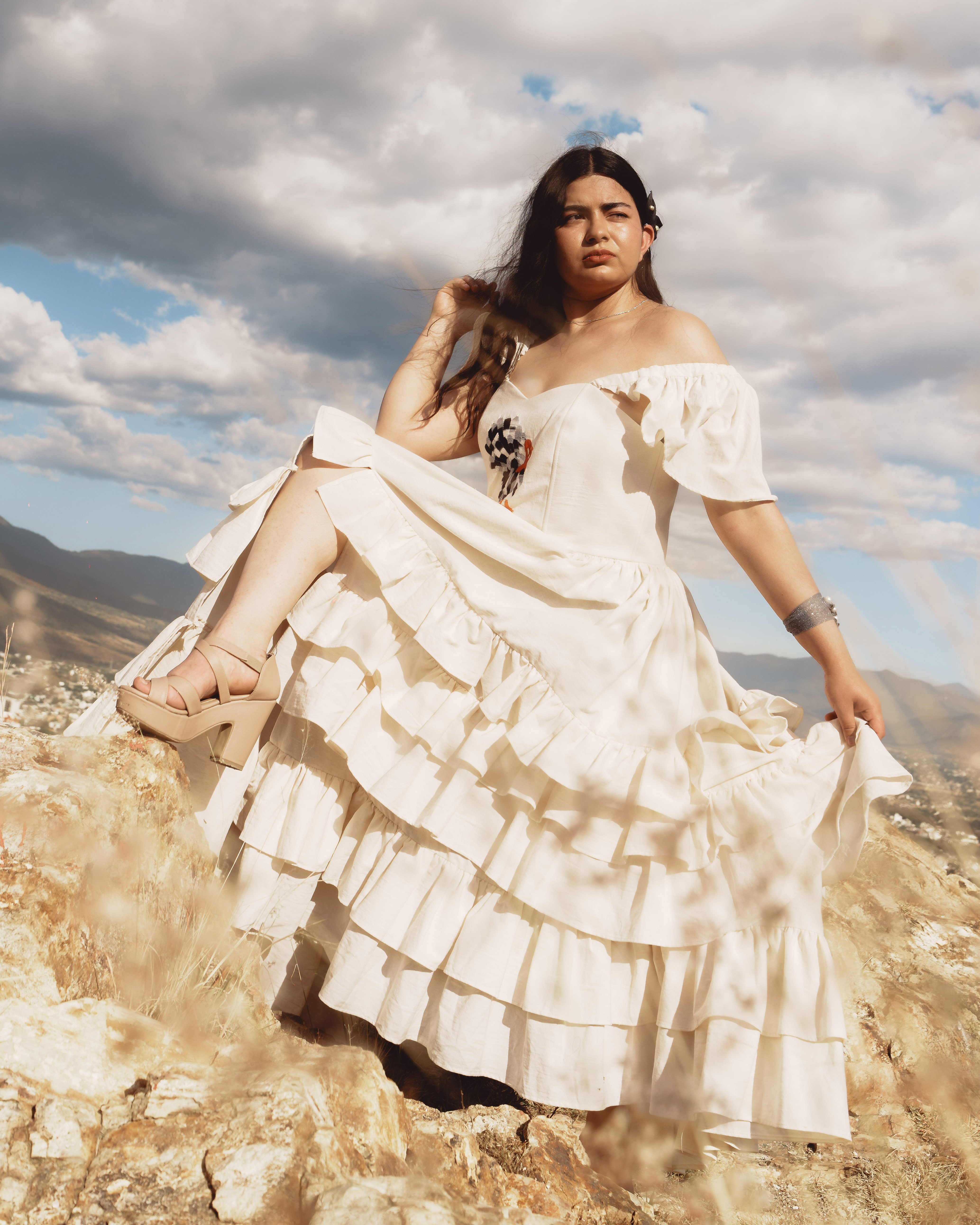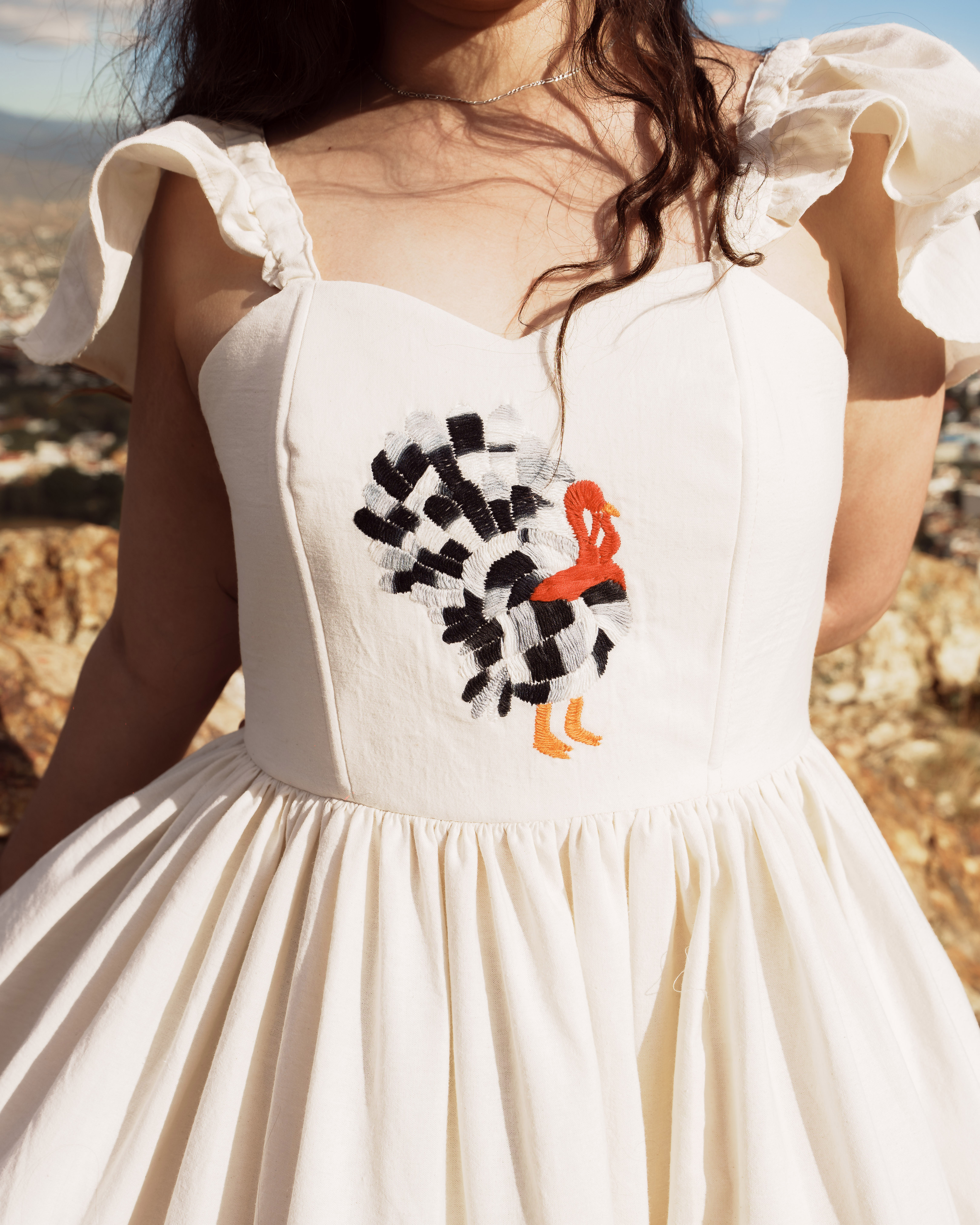 Vestido hecho de manta, con blusa tipo corset en donde se borda un guajolote, en las mangas pequeños olanes y en la falda una abertura en la pierna derecha además de olanes hechos de manta natural y negra.