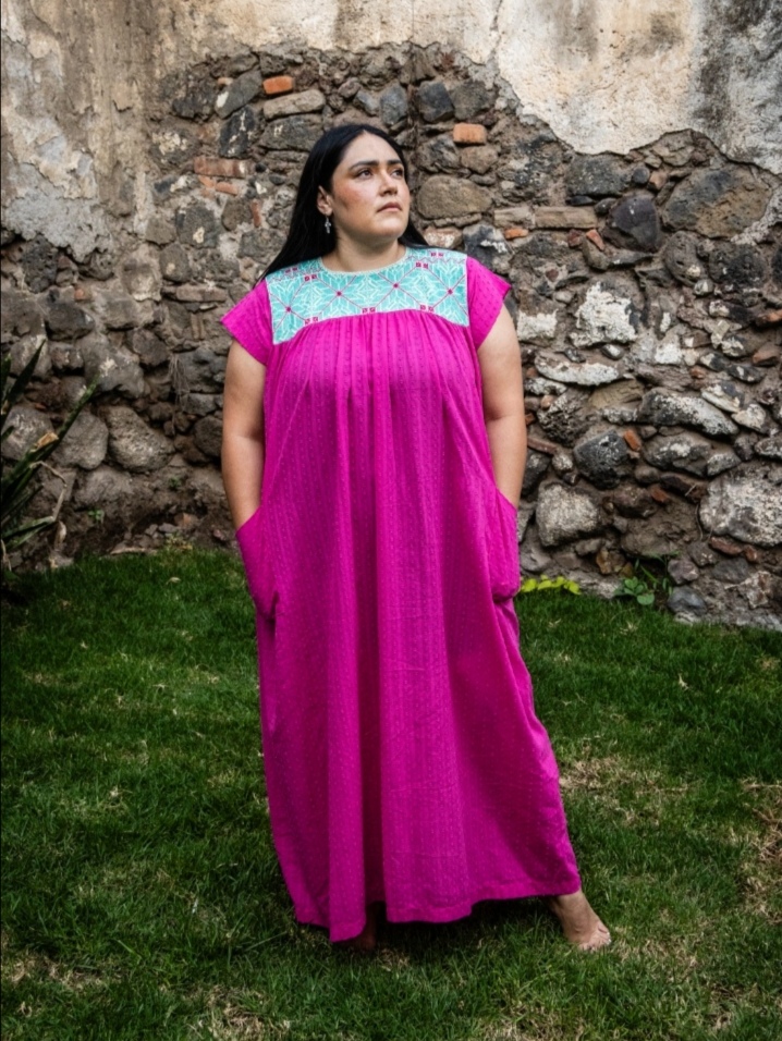 Déjate enamorar por nuestro vestido en un color rosa vibrante, una pieza diseñada para resaltar tu belleza con total comodidad. El protagonista es su delicado bordado floral central, un homenaje a la artesanía que añade un toque de color y distinción, ideal para quienes buscan una prenda versátil, cómoda y con identidad cultural.