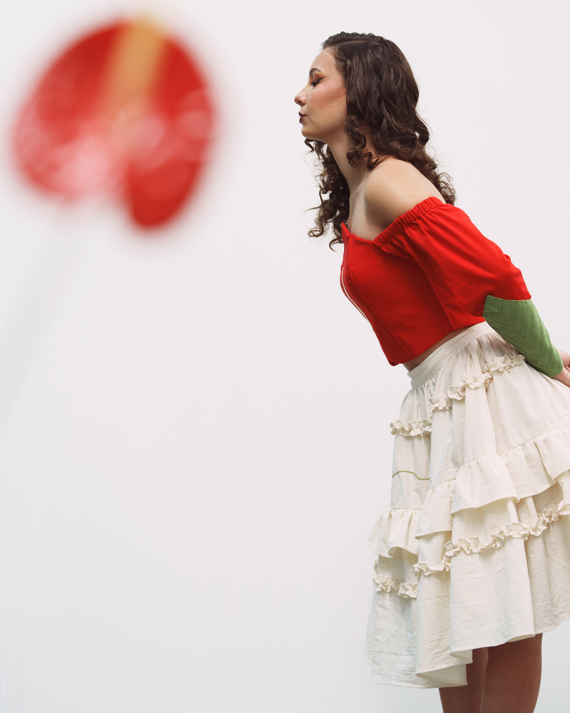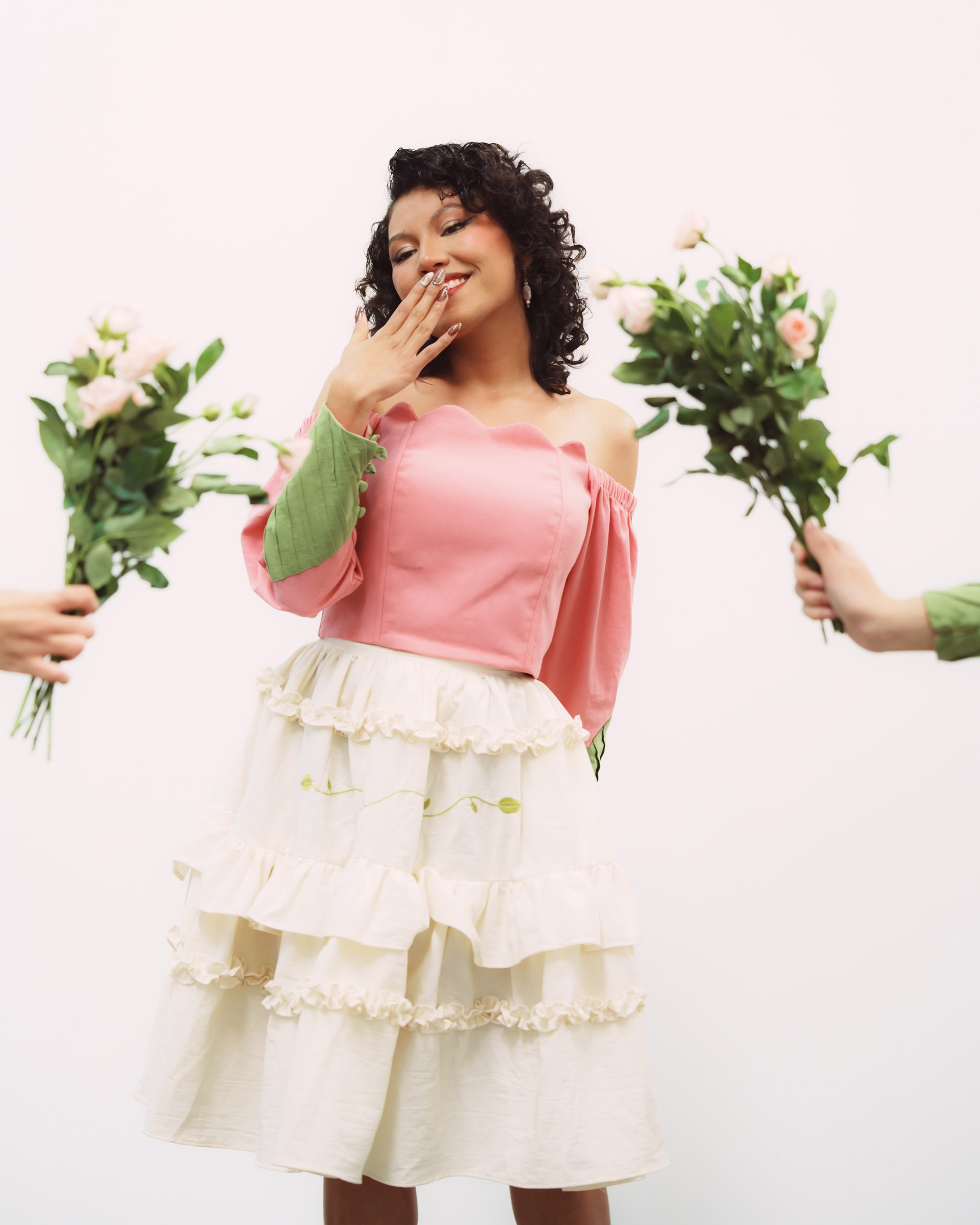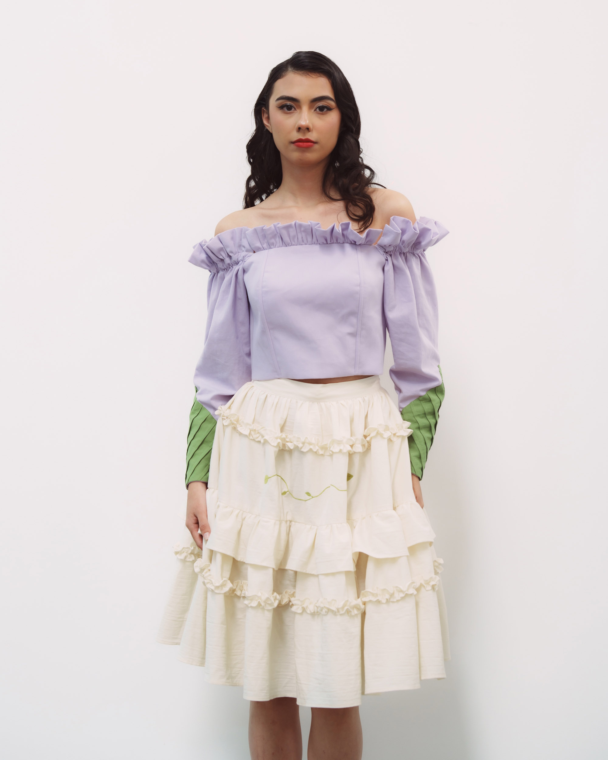 Vestido compuesto por un corset hecho de manta de algodón, con diferentes cortes, y nuestras caracteristicas alforzas en las mangas en color verde que simulan una hoja y una falda hecha de manta de algodón en color natural, con detalles de olanes y plisado. Asi como una falda donde al centro se borda una rama en cadenita. Largo de falda de 60 cms.