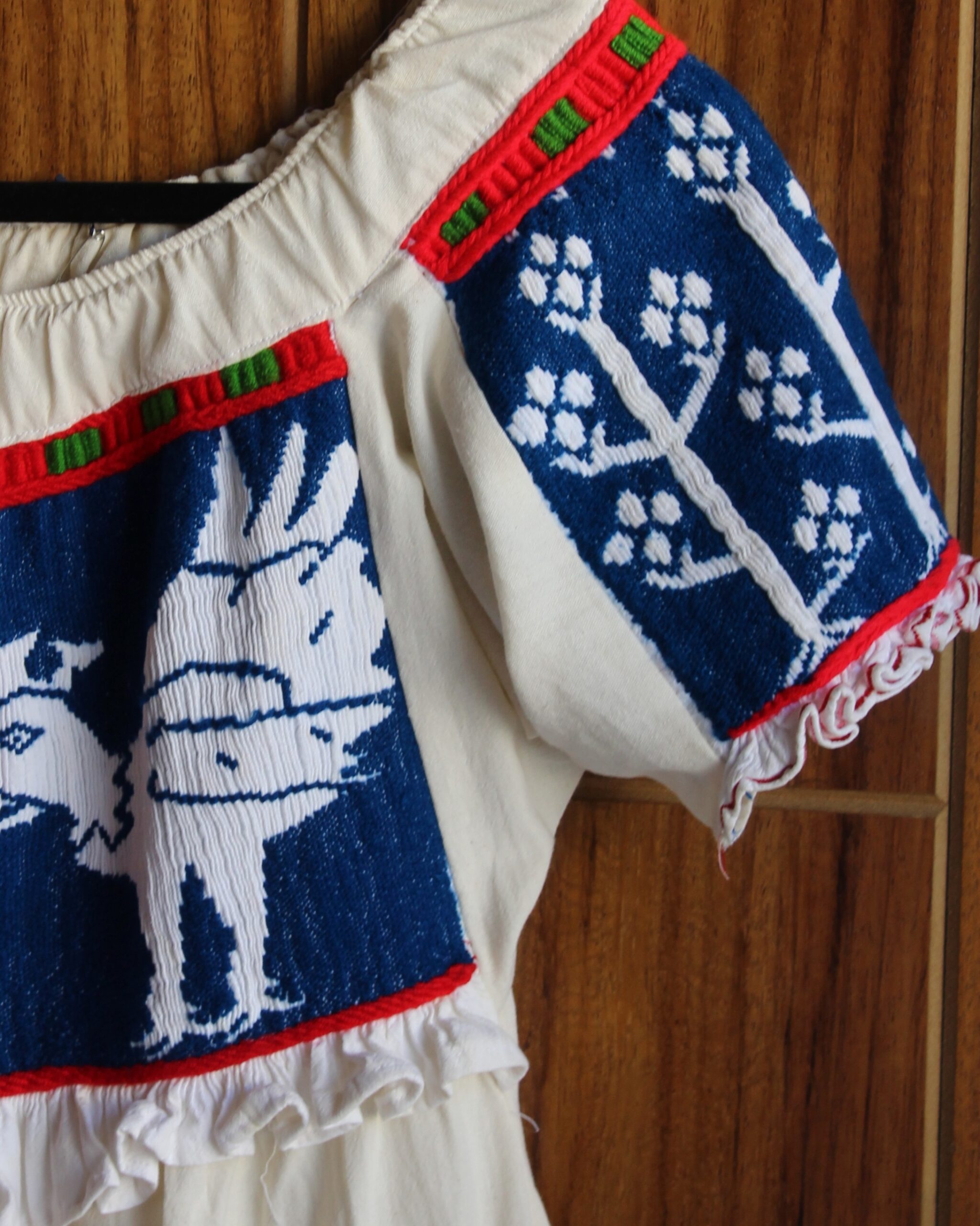Vestido color natural, con guayabas bordadas en azul, elaborado en técnica de pepenado fruncido, que destaca por sus detalles artesanales y estilo tradicional.