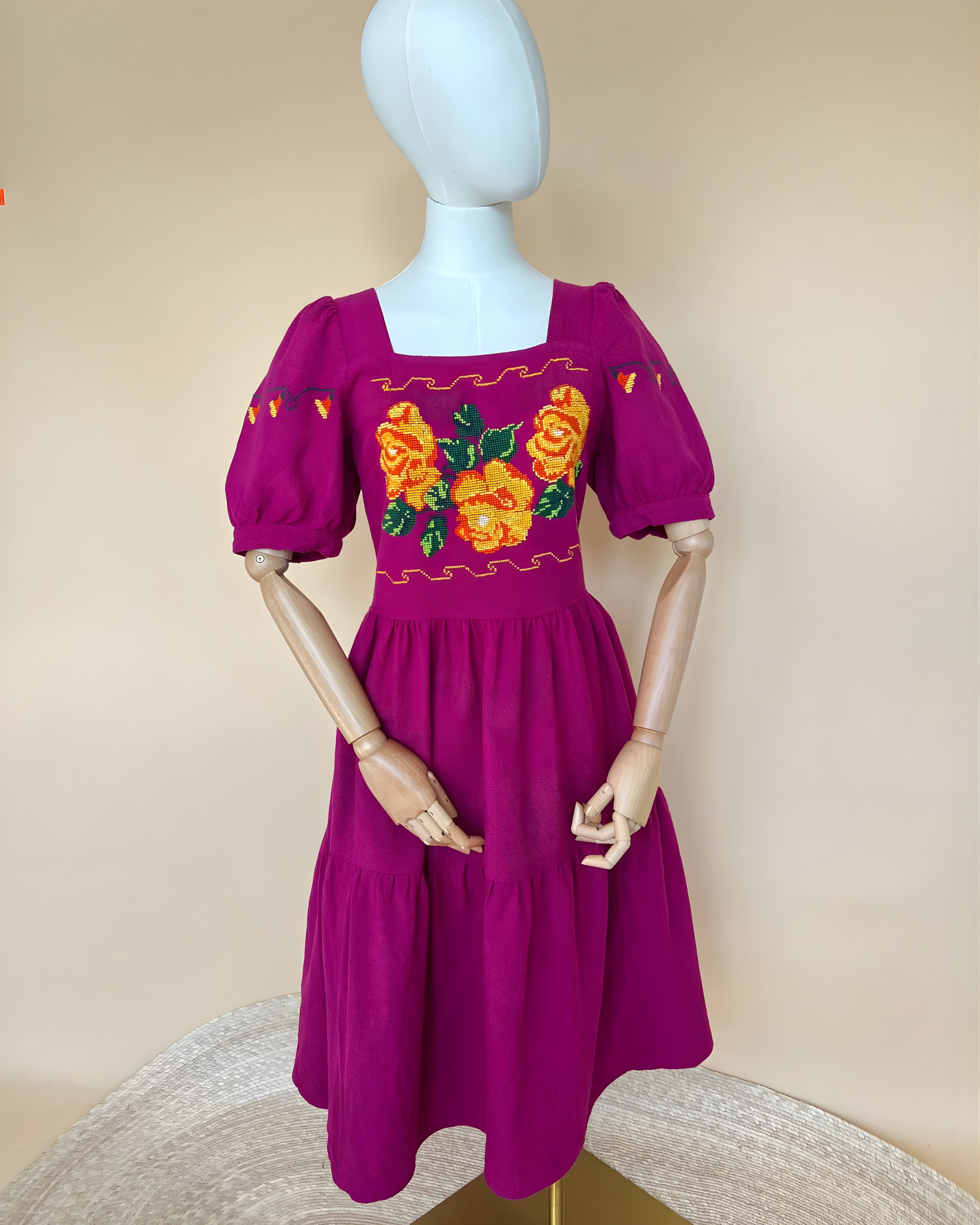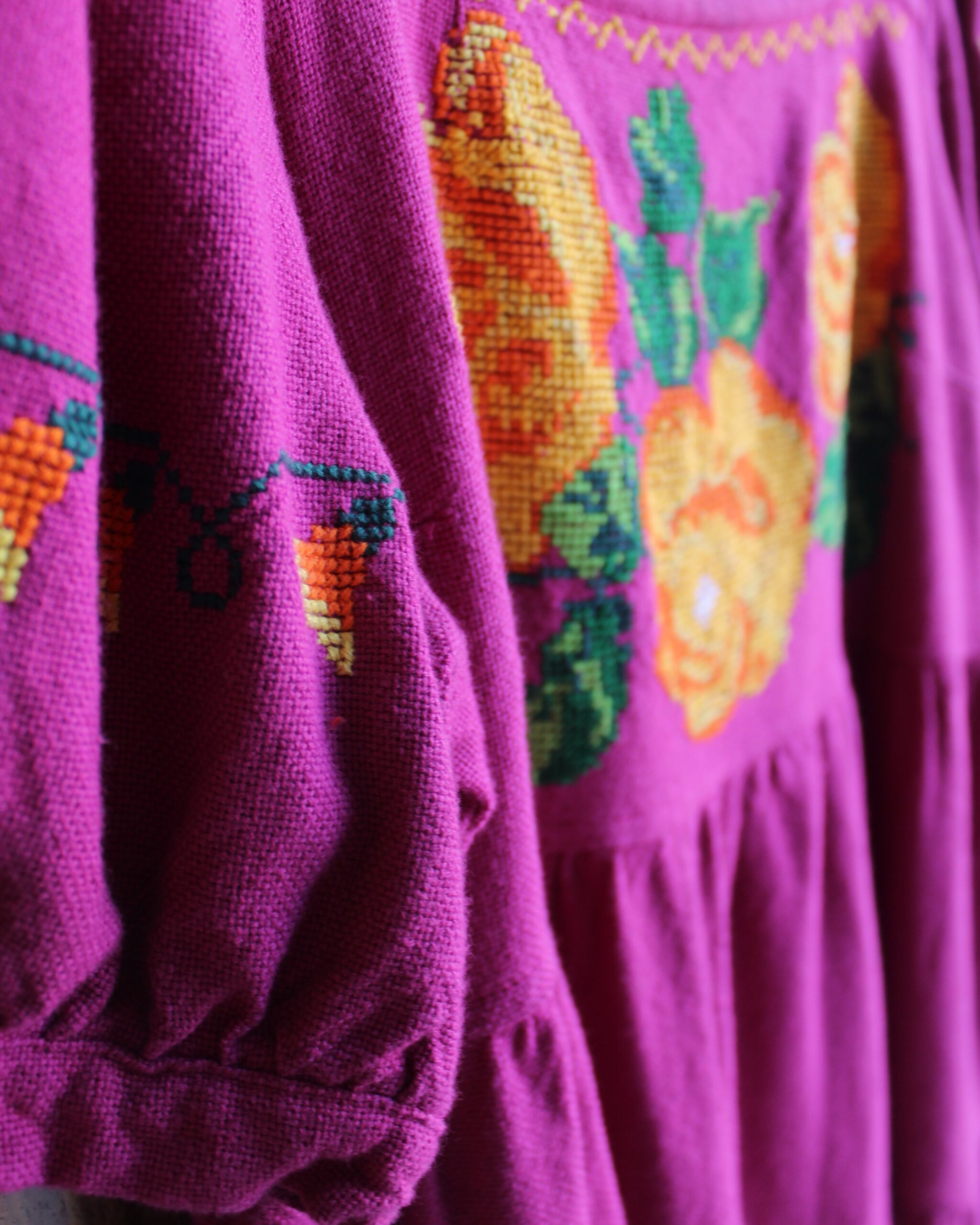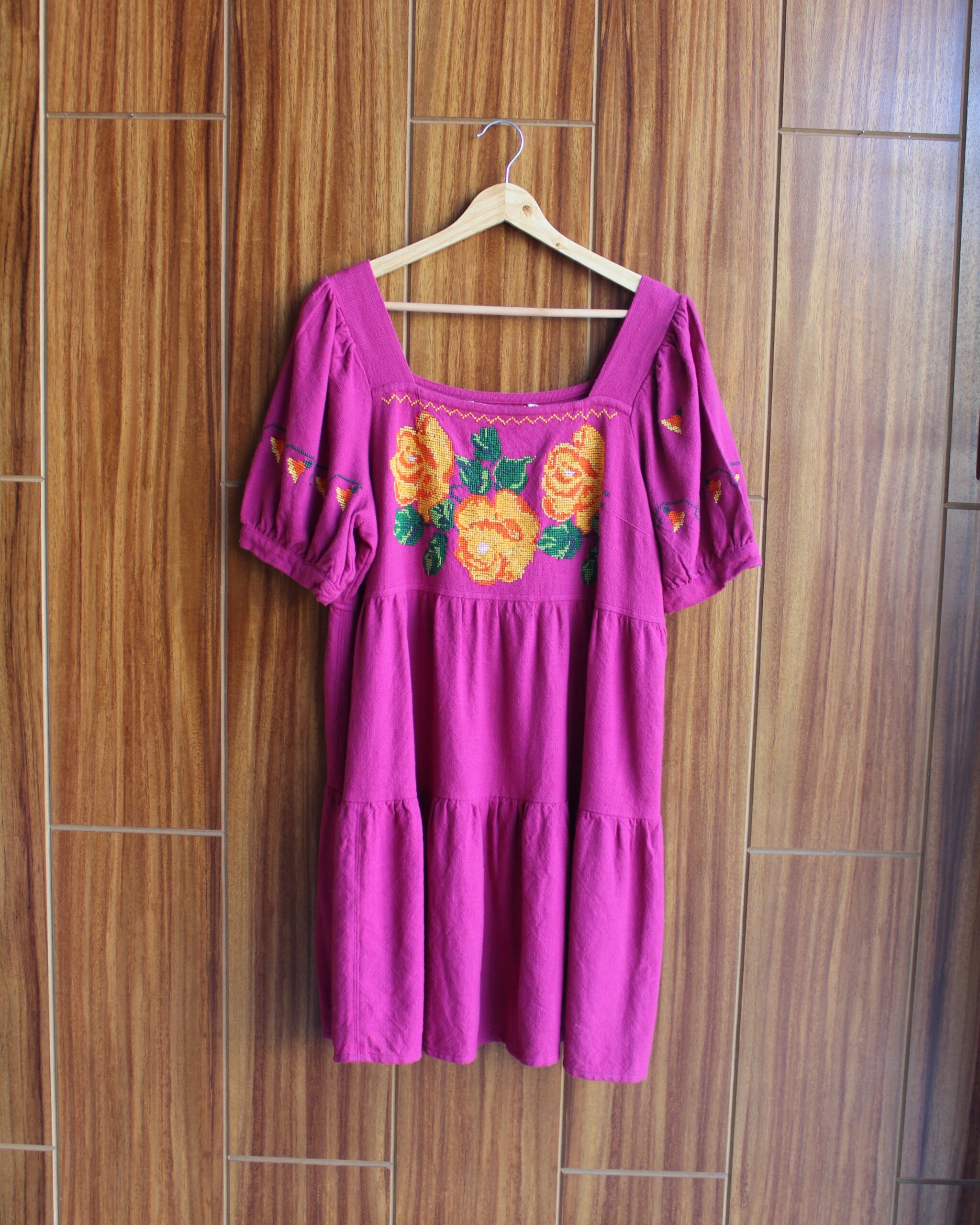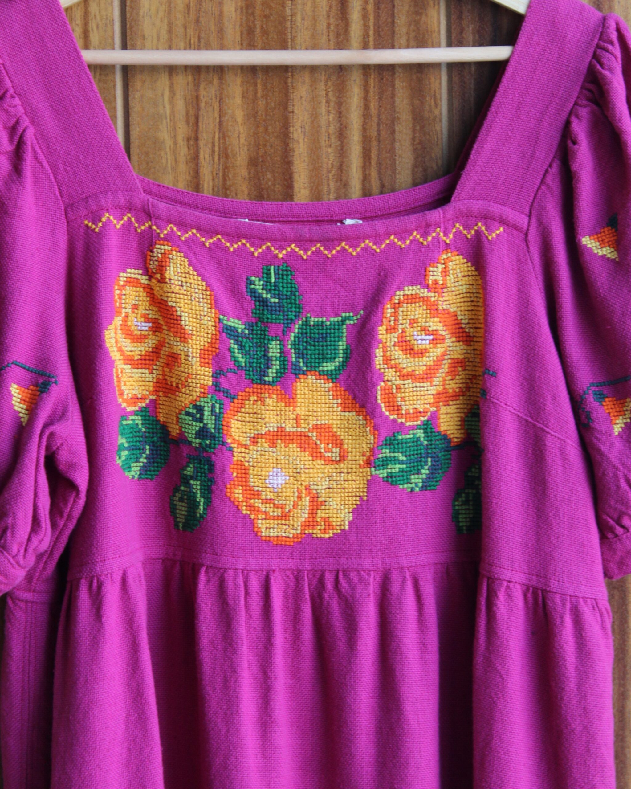 Vestido hecho en Michoacán en telar de pedal en color bugambilia con bordado en punto de cruz de flores.