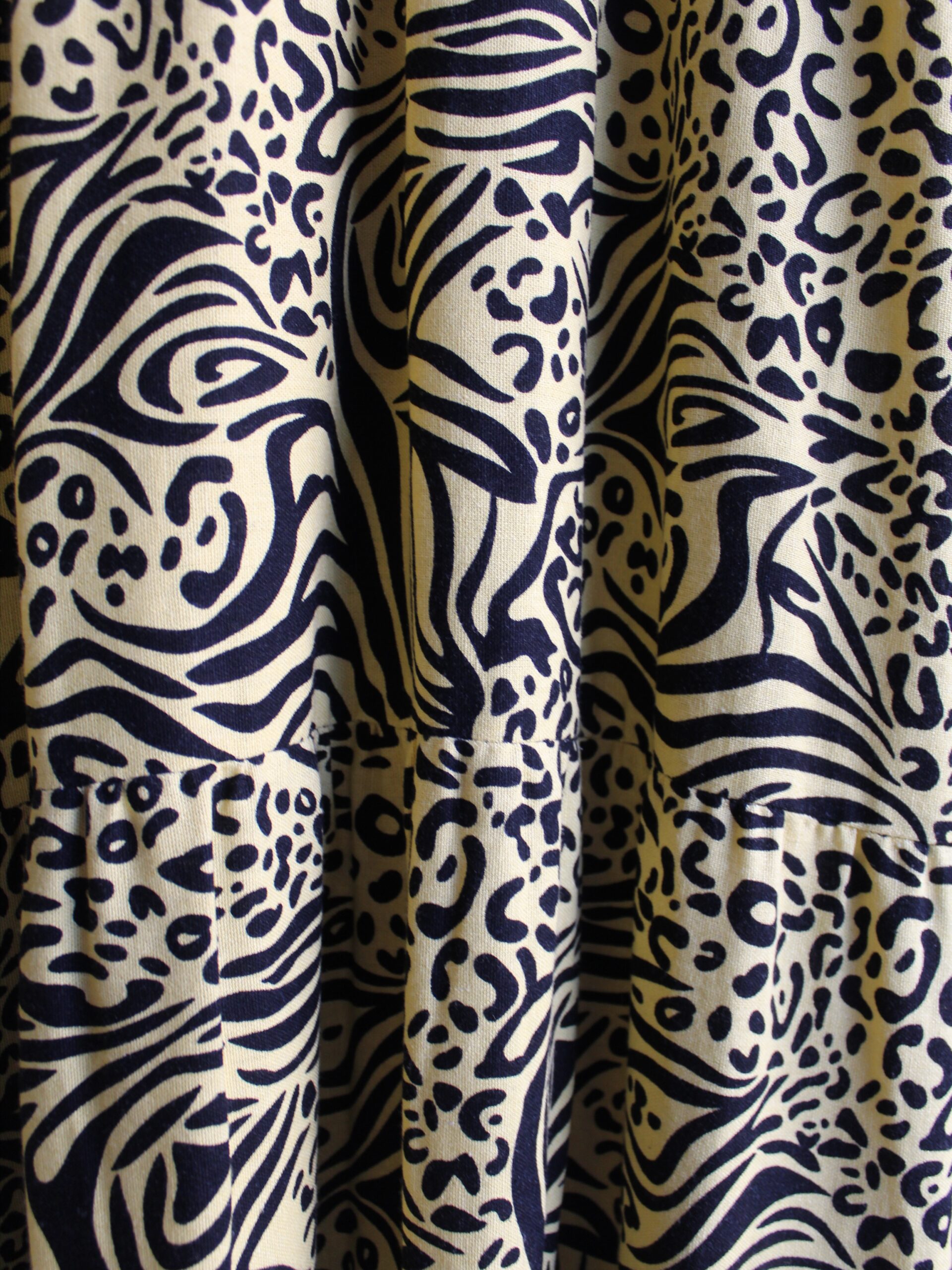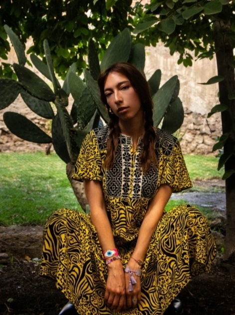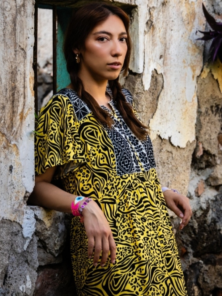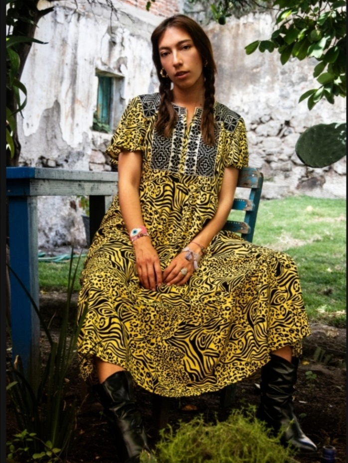 Eleva tu estilo con nuestro nuevo maxi vestido, una pieza que rompe esquemas al combinar un vibrante estampado animal print con la elegancia de una pechera geométrica bordada en contraste. Su caída fluida y mangas ofrecen un movimiento espectacular, ideal para una mujer que no teme destacar.
